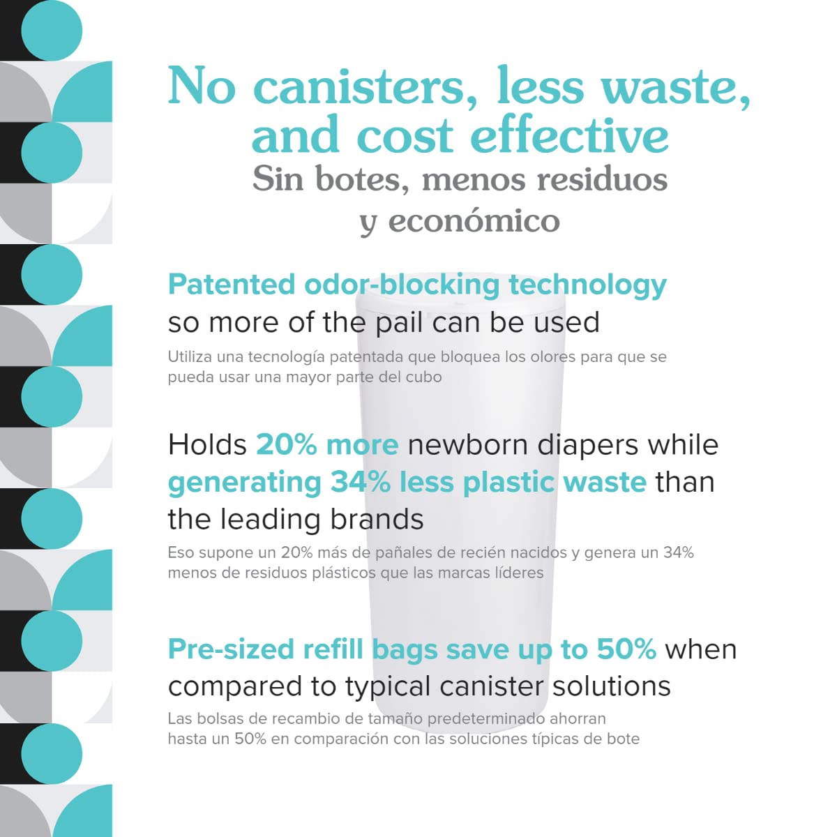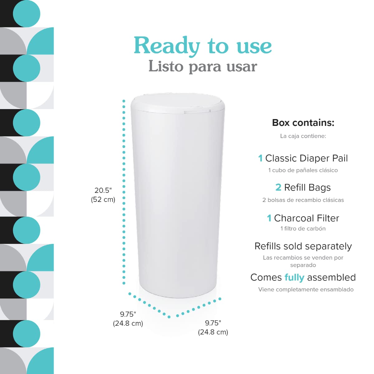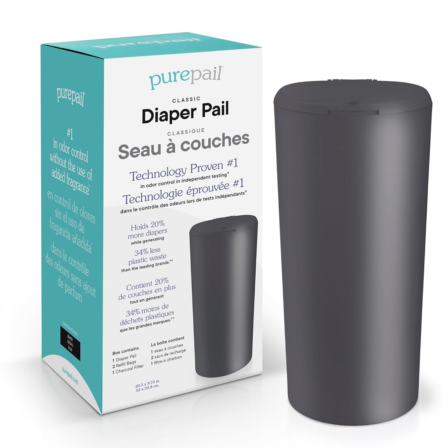 ALL-IN-ONE DIAPER PAIL WITH LARGER CAPACITY, GREENER FOOTPRINT: Uses patented odor-blocking technology so more of the pail can be used. At only 20.5" x 9.75" (52.1 cm x 24.8 cm), PurePail Classic holds up to 55 newborn diapers. That's 20% more newborn diapers while generating 34% less plastic waste than the leading brands. Pre-sized refill bags save up to 50% when compared to typical canister solutions. No canisters, less waste, and cost effective101 IN ODOR CONTROL: Proven #1 in odor control without the use of added fragrance in independent testing. Bags remain sealed while the lid is open to prevent escaping odor. Charcoal filter absorbs odors without added fragrance. Inhale the sweetness of parenting—not the stink10EASY TO USE: Comes fully assembled. Lid opens with one tap. Easy bag change. No cutting or canisters. Child safety lock keeps curious little hands out. Includes 1 Classic Diaper Pail + 2 Refill Bags + 1 Charcoal Filter. Refills sold separately10MADE OF POLYPROPYLENE: BPA free. Won’t absorb odors. Can be cleaned and sanitized with household cleaners. And recyclable!104 YEAR MANUFACTURER’S WARRANTY: Guaranteed to be free of defects and backed by a twelve (12) month limited warranty (details apply). Contact Manufacturer directly for warranty