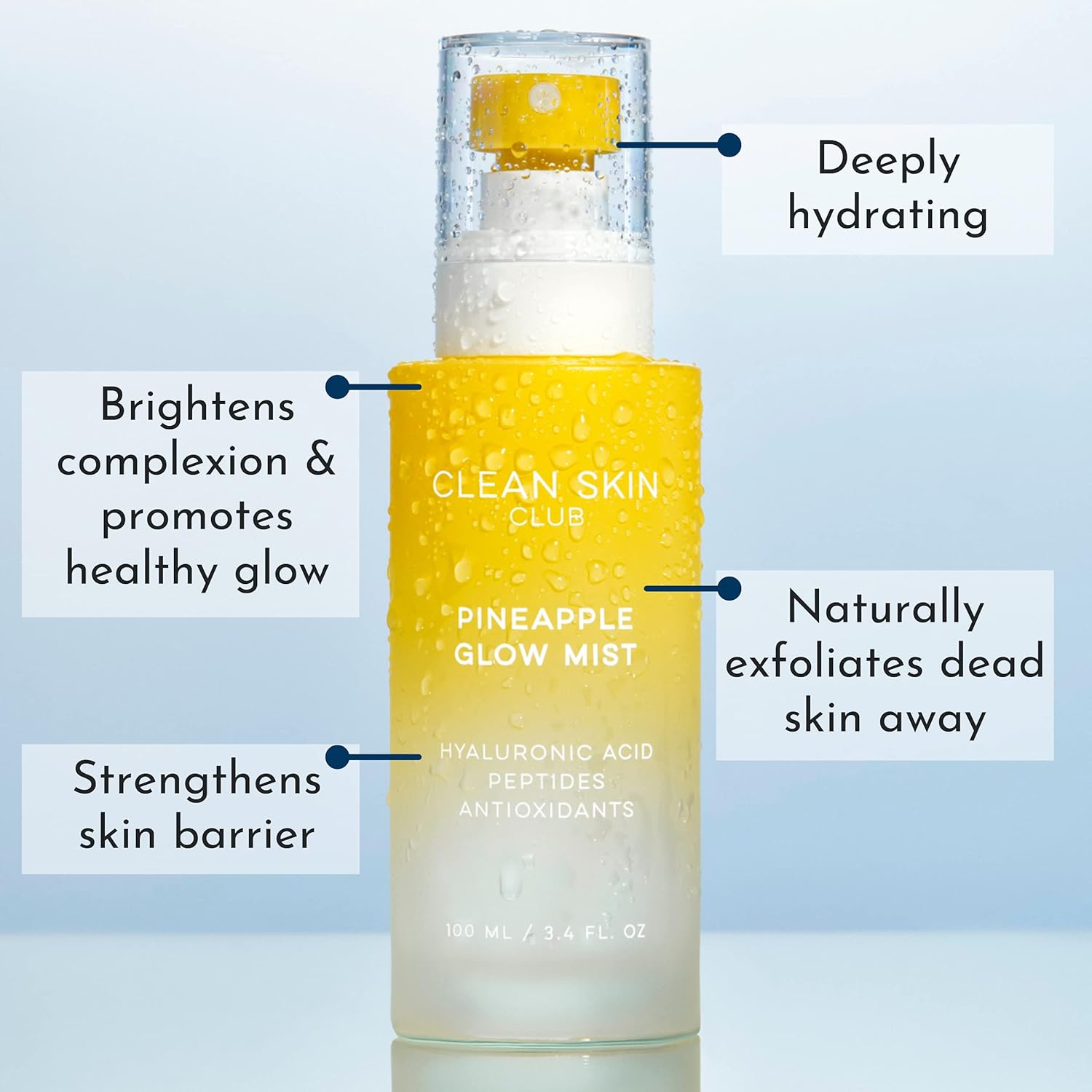 CLEAN SKIN CLUB Pineapple Glow Mist | Hyaluronic Acid + Peptides | Papaya + Coconut Extracts | Hydrating & Fortifying Face Spray | Vegan & Cruelty Free,Hydrating Pineapple Glow Mist: Instantly refreshes and brightens skin with pineapple and papaya extracts for a luminous, dewy finish,Multi-Tasking Facial Mist: Use as a toner, makeup setting spray, or anytime skin needs a boost of hydration and radiance,Enriched with Hyaluronic Acid: Deeply hydrates and plumps skin, helping to smooth texture and maintain moisture balance,Gentle & Clean Formula: Vegan, cruelty-free, dermatologist-tested, and free from parabens, sulfates, and artificial fragranceāideal for all skin types, including sensitive,Tropical Scent Experience: Natural fruit extracts provide a subtle, refreshing scent without synthetic fragrances