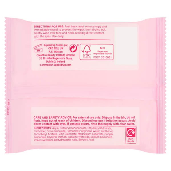 Product Information:Biodegradeable Cleansing Facial Wipes For Normal Skin, Gently Cleanse And Refresh, Removes Waterproof Mascara, Dermatologically Approved, Made From 100% Plant Derived Fibres,Product Specification:Aqua, Cetearyl Isononanoate, Ethylhexyl Palmitate, Carbomer, Coco-Glucoside, Hamamelis Virginiana Water, Panthenol, Tocopheryl Acetate, Zinc Gluconate, Magnesium Aspartate, Copper Gluconate, Glycerin, Parfum, Sodium Hydroxide, Sodium Gluconate, Phenoxyethanol, Dehydroacetic Acid, Benzoic Acid,Product Uses:Use Daily