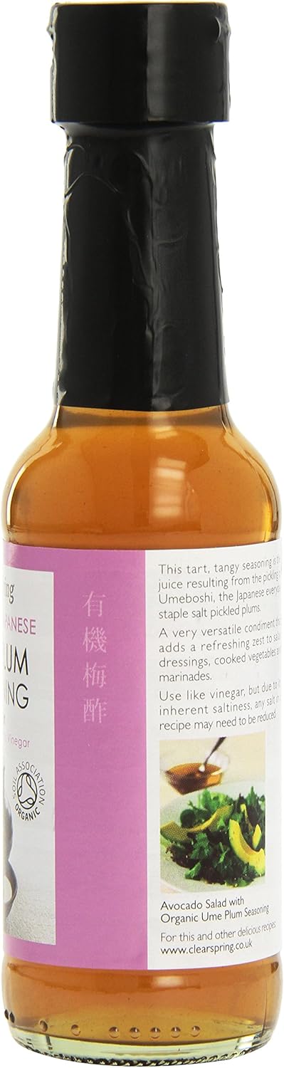 Product Description Due to the challenge of sourcing organic shiso leaves this recipe is made just with ume plums and sea salt. This tart, tangy seasoning is the juice resulting from the pickling of umeboshi, the Japanese everyday staple salt pickled plums. A very versatile condiment that adds a refreshing zest to salad dressings, cooked vegetables and marinades. Use like vinegar, but due to its inherent saltiness, any salt in a recipe may need to be reduced. Ingredients Ume Plums (80%), Sea Salt. Organically Grown. P.when('A').execute(function(A) { A.on('a:expander:toggle_description:toggle:collapse', function(data) { window.scroll(0, data.expander.$expander[0].offsetTop-100); }); }); Directions Adds a refreshing zest to salad dressings, cooked vegetables and marinades. Use like vinegar, but due to its inherent saltiness, any salt in a recipe may need to be reduced. Safety Warning No Warning Applicable Box Contains Each order comes with 1 x Clearspring Organic Japanese Ume Plum Seasoning 150 ml Manufacturer Contact Information Clearspring Ltd., 19A Acton Park Estate, London W3 7QE, UK. See more,The recipe is made just with use plums and sea salt,The tart, tangy seasoning is the juice resulting from the pickling of umeboshi,Japanese everyday staple salt pickled plums,A refreshing zest to salad dressings, cooked vegetables and marinades