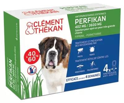 Clément Thékan Perfikan 402Mg/3600Mg Very Large Dogs 4 Pipettes Is An Anti-Pest Solution For Spot-On Adapted To The Very Large Dogs Of 40 To 60 Kg. This Product Allows To Treat The Infestations For The Fleas Or Ticks Or Also If A Repulsive Activity (Anti-Engorgement) Against Sand-Flies And/Or Mosquitoes Are Also Necessary. The Insecticidal Efficacy Of The Product Persists Up To 4 Weeks Against The Fleas, Ticks And Also Sand-Flies And Mosquitoes