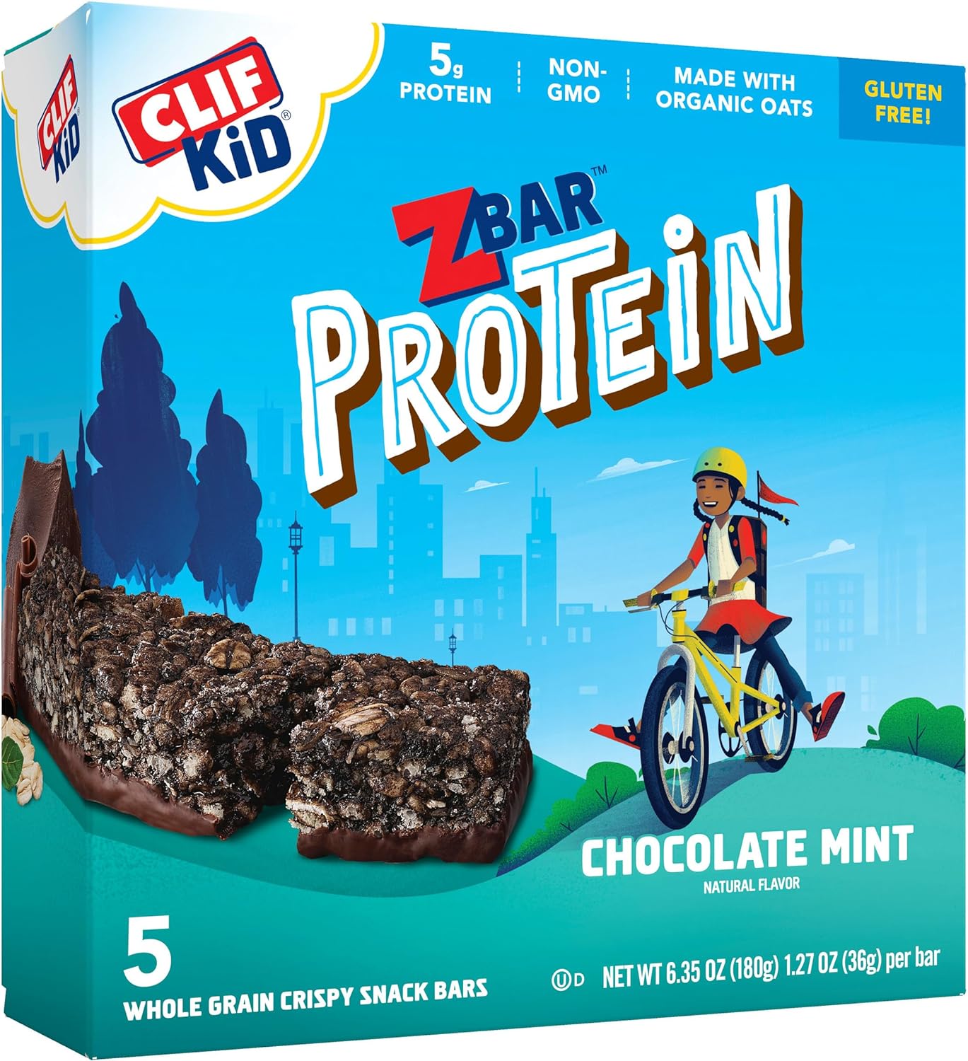 DESCRIPTION : CLIF Kid Zbar Protein - Chocolate Mint - Crispy Whole Grain Snack Bars - Made with Organic Oats - Non-GMO - 5g Protein - 1.27 oz. (5 Pack)