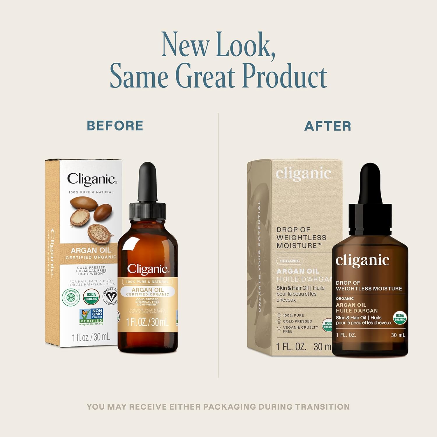 Cliganic Organic Argan Oil, 100% Pure (1Oz) - For Hair, Face & Skin | Cold Pressed Carrier Oil (Packaging May Vary)