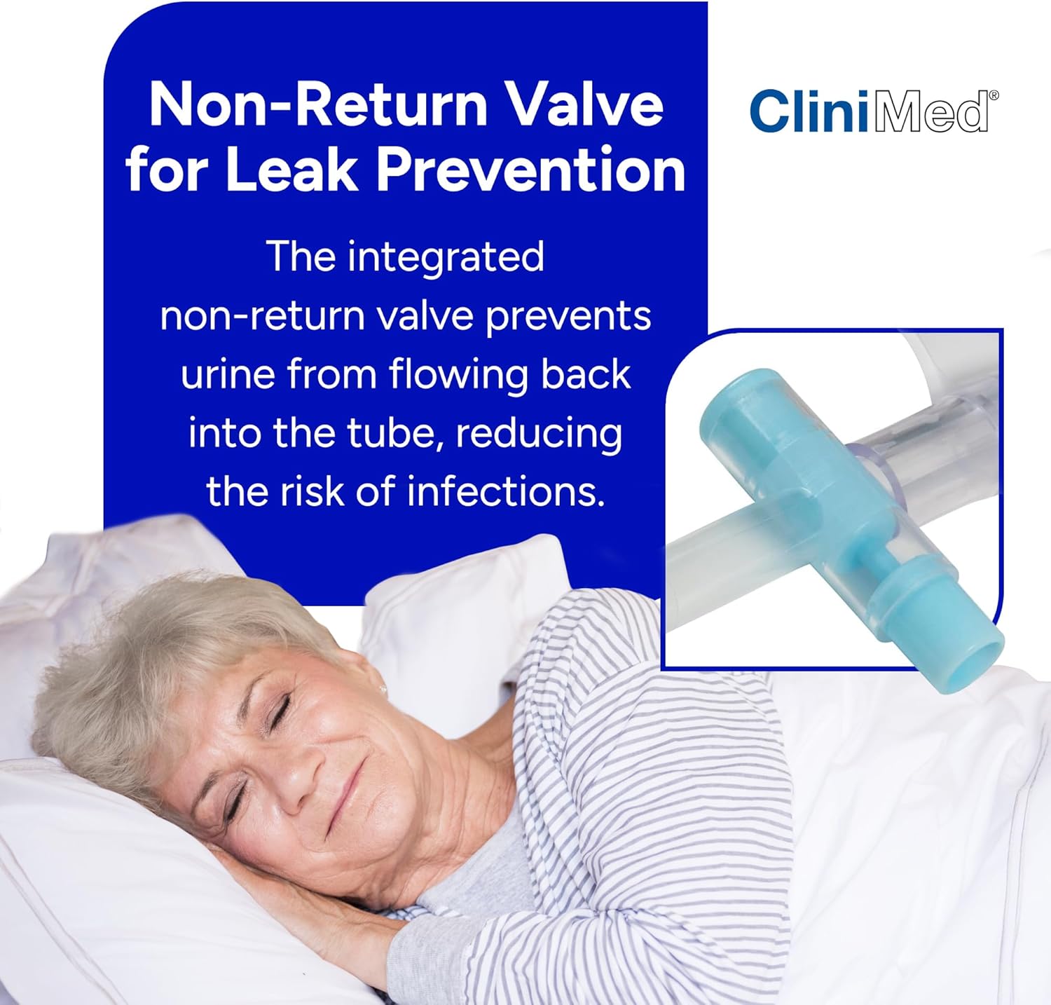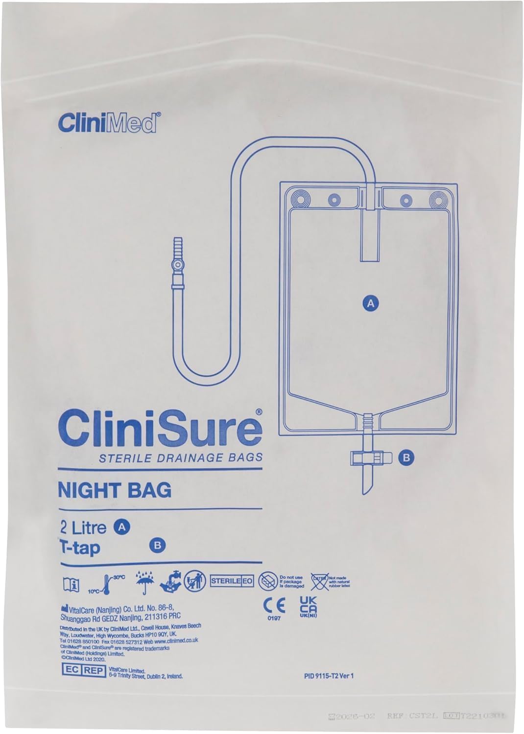Get peace of mind with CliniSure's 2L night drainage bags. These sterile urine collection bags feature a secure universal connector that works with most catheters and sheaths, whilst the non-return valve ensures leak-free overnight drainage. The soft, medical-grade tubing and easy-to-use T-tap make night-time comfort a priority. Each pack contains 10 individually wrapped bags, ready when you need them,SECURE CONNECTION - The ridged universal connector creates a firm grip, preventing unwanted midnight leaks. It's engineered to work seamlessly with most indwelling catheters and catheter leg bag holders, giving you peace of mind while you rest,OVERNIGHT CONFIDENCE - Sleep soundly with our medical bags featuring clever non-return valves that keep everything flowing one way. The catheter bag holder ensures stable positioning for reliable, continuous drainage throughout the night,COMFORT YOU CAN TRUST - Soft, flexible tubing ensures a secure, stable connection while allowing natural movement. Designed for overnight comfort, it provides smooth drainage with minimal disruption,SMART DESIGN FEATURES - The 2L capacity balances size and practicality. Compatible with any catheter night bag stand, the bag's design includes graduated markings and a sturdy frame that supports proper drainage positioning,TOTAL CONVENIENCE - Each sterile bag comes individually wrapped for absolute hygiene. The universal design means no faffing about with compatibility - just quick, straightforward attachment when you need it most