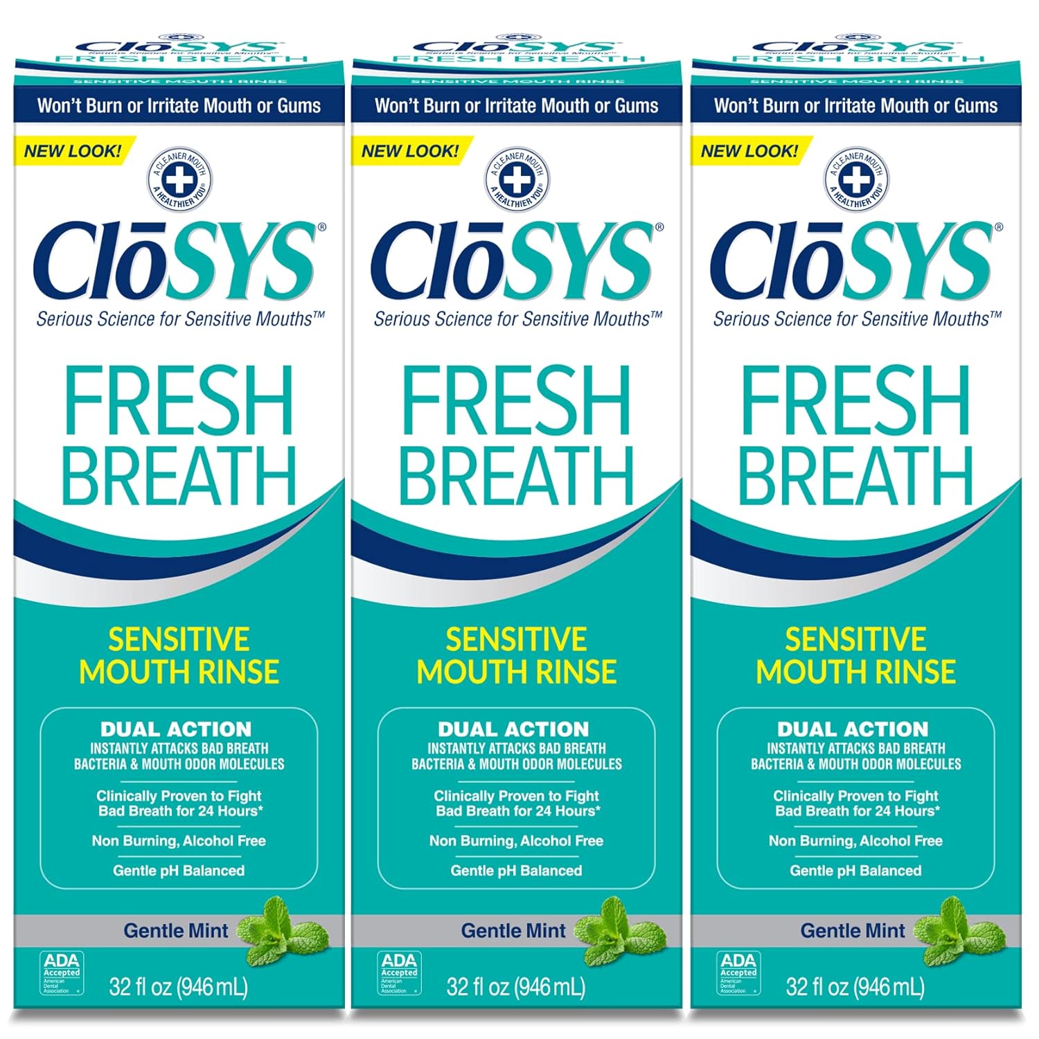 Closys Fresh Breath Sensitive Mouthwash, Gentle Mint, Alcohol Free, Dye Free, Ph Balanced, Helps Soothe Entire Mouth, Fights Bad Breath - 32 Oz (Pack Of 3)