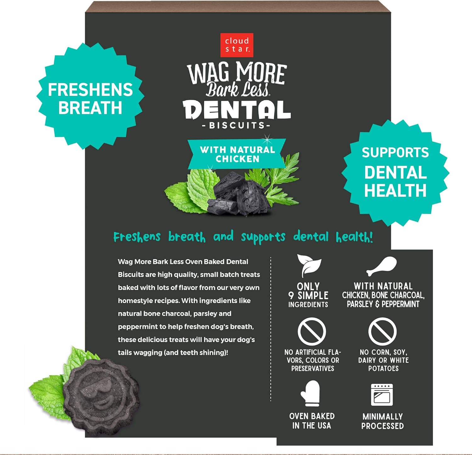 Freshens Breath And Supports Dental Health! Wag More Bark Less Oven Baked Dental Biscuits Are High Quality, Small Batch Treats Baked With Lots Of Flavor From Our Very Own Homestyle Recipes. With Ingredients Like Natural Bone Charcoal, Parsley And Spearmint To Help Freshen Dog'S Breath, These Delicious Treats Will Have Your Dog'S Tails Wagging (And Teeth Shining)!