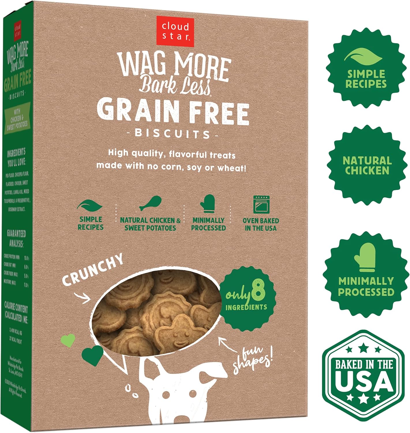 Cloud Star Wag More Bark Less - Dog Treats - Crunchy Biscuits - Grain Free Chicken & Sweet Potato - 14 Oz Box