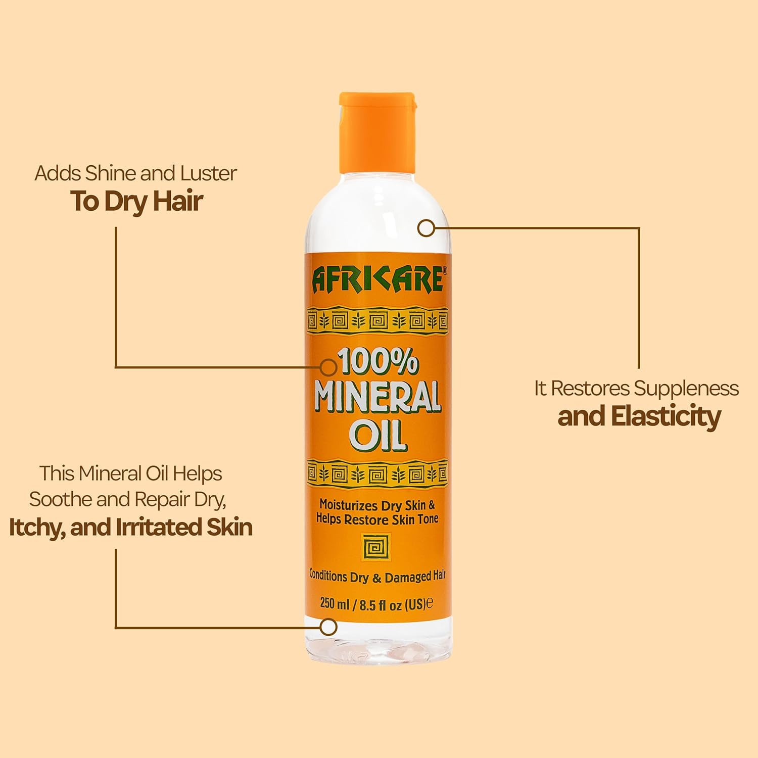 100% MINERAL OIL - Africare 100% mineral oil delivers deep moisture to both your skin and scalp to create a protective barrier and lock in moisture