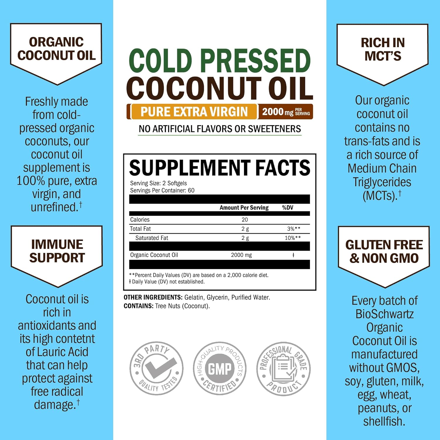 About this item Organic coconut oil - highest grade available: Freshly made from cold-pressed organic coconuts, our coconut oil supplement is 100% pure, extra virgin, unrefined & gluten free, non-gmo and solvent free. The best coconut oil pills and coconut oil for skin in the market Amazing beauty & health benefits - Studies show that coconut oil (cold pressed coconut oil) supports healthy hair, skin and nails and energy levels. Helps with occasional constipation Expert formulation - BioSchwartz coconut oil softgels are made in the USA with the finest globally sourced ingredients and third party tested for purity and potency, offering better absorption than coconut oil capsules Unrefined coconut oil rich in fatty acids & mct our organic coconut oil (MCT oil occurs naturally in coconut oil) contains no trans-fats and is a rich source of Medium Chain Triglycerides (MCTs), such as lauric acid (C-12) and caprylic acid (C-8) Setting a New High Standard for Quality - To ensure our coconut oil is safe, effective, and superior in quality, every bottle is made with care in a cGMP facility right here in the USA using only the highest quality globally sourced ingredients - with zero GMOs, fillers, color additives, binders, or preservatives โบ See more product details,Organic coconut oil - highest grade available: Freshly made from cold-pressed organic coconuts, our coconut oil supplement is 100% pure, extra virgin, unrefined & gluten free, non-gmo and solvent free. The best coconut oil pills and coconut oil for skin in the market,Amazing beauty & health benefits - Studies show that coconut oil (cold pressed coconut oil) supports healthy hair, skin and nails and energy levels. Helps with occasional constipation,Expert formulation - BioSchwartz coconut oil softgels are made in the USA with the finest globally sourced ingredients and third party tested for purity and potency, offering better absorption than coconut oil capsules,Unrefined coconut oil rich in fatty acids & mct our organic coconut oil (MCT oil occurs naturally in coconut oil) contains no trans-fats and is a rich source of Medium Chain Triglycerides (MCTs), such as lauric acid (C-12) and caprylic acid (C-8),Setting a New High Standard for Quality - To ensure our coconut oil is safe, effective, and superior in quality, every bottle is made with care in a cGMP facility right here in the USA using only the highest quality globally sourced ingredients - with zero GMOs, fillers, color additives, binders, or preservatives