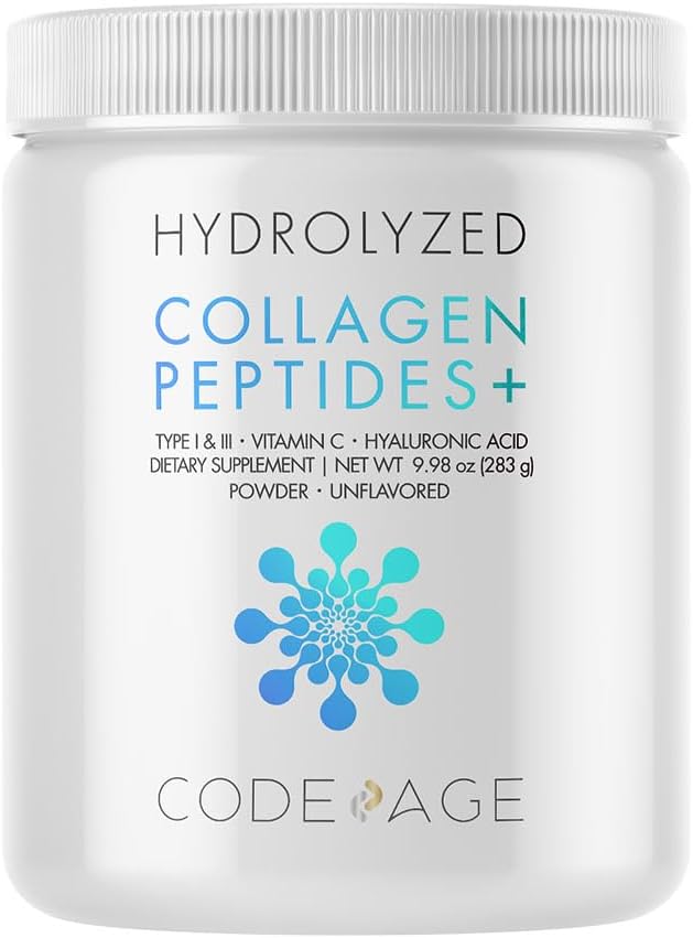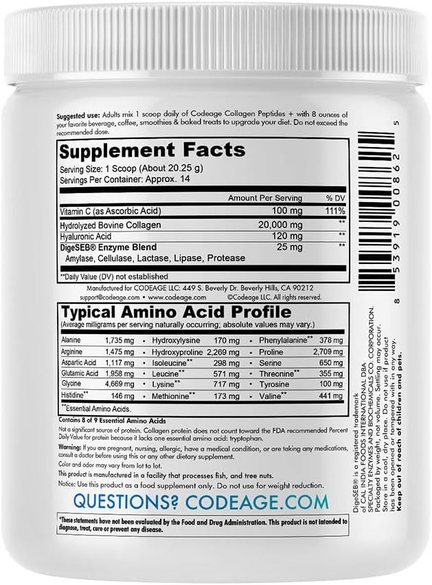 2 > Vitamin C, Hyaluronic Acid, Amino Acids: Codeage collagen powder for women and men contains 100 mg of vitamin C per serving. This hydrolyzed collagen powder also features hyaluronic acid and 18 amino acids all-in-one