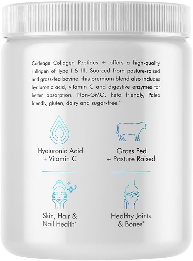 DESCRIPTION : Codeage Collagen Peptides Powder + Vitamin C, Digestive Enzymes, Hyaluronic Acid, Amino Acids - Hydrolyzed Protein Collagen Type I & III Grass Fed Collagen - Non-GMO, Gluten-Free, Unflavored - 9.98 oz