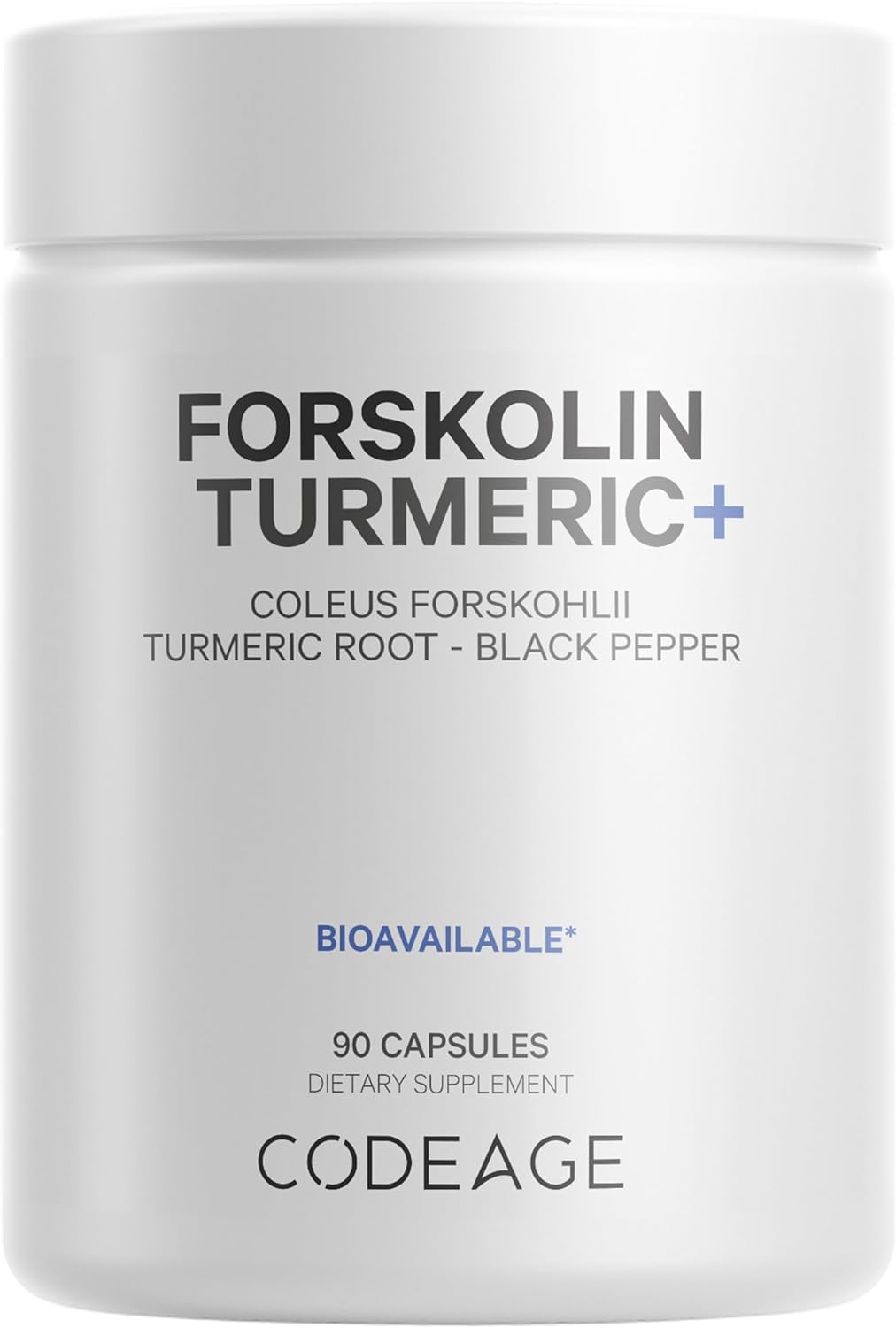 DESCRIPTION : Codeage Forskolin, Pure Forskolin Coleus + Organic Turmeric Root Powder, 95% Curcuminoids + Bioperine Black Pepper for Absorption - 20% Standardized Coleus Forskohlii, Non-GMO, 90 Capsules