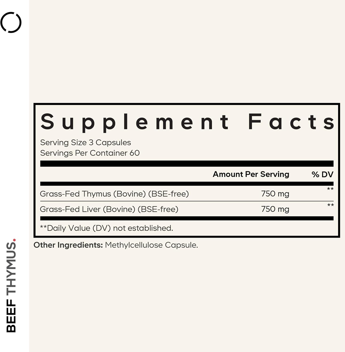 About this item Premium Grass-Fed Thymus & Liver: Codeage Grass-Fed Beef Thymus supplement provides 750 mg of grass-fed and pasture-raised bovine thymus and 750 mg of grass-fed bovine liver per serving, sourced from high-quality beef. Freeze-Dried and Nutrient Preserved: These bovine thymus vitamin supplement ingredients are freeze-dried, desiccated, and non-defatted to help retain their nutritional profile. Bovine Superfood Source: Thymus and liver may offer sources of vitamins and nutrients inherent to these organs, such as vitamin A, vitamin B12, iron, zinc, and copper. Non-GMO & Hormone-Free: Codeage bovine thymus capsule supplement is non-GMO, dairy-free, soy-free, gluten-free, and free of hormones. Manufactured in the USA: Codeage Grass-Fed Beef Thymus supplement is manufactured in the USA with global ingredients in a cGMP-certified facility for quality and purity. › See more product details,Premium Grass-Fed Thymus & Liver: Codeage Grass-Fed Beef Thymus supplement provides 750 mg of grass-fed and pasture-raised bovine thymus and 750 mg of grass-fed bovine liver per serving, sourced from high-quality beef,Freeze-Dried and Nutrient Preserved: These bovine thymus vitamin supplement ingredients are freeze-dried, desiccated, and non-defatted to help retain their nutritional profile,Bovine Superfood Source: Thymus and liver may offer sources of vitamins and nutrients inherent to these organs, such as vitamin A, vitamin B12, iron, zinc, and copper,Non-GMO & Hormone-Free: Codeage bovine thymus capsule supplement is non-GMO, dairy-free, soy-free, gluten-free, and free of hormones,Manufactured in the USA: Codeage Grass-Fed Beef Thymus supplement is manufactured in the USA with global ingredients in a cGMP-certified facility for quality and purity