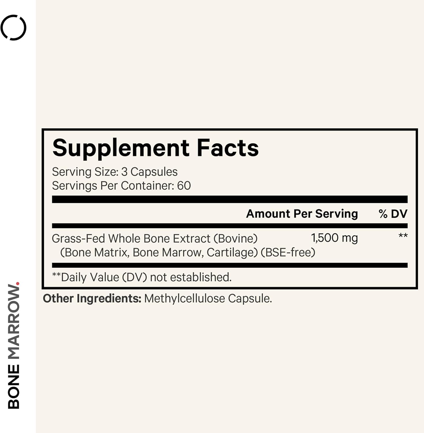 About this item Freeze-Dried & Grass-Fed Bone Marrow: Codeage Grass-Fed Bone Marrow supplement provides 1,500 mg of grass-fed and pasture-raised bovine bone marrow per serving, including bone matrix, marrow, and cartilage. Ingredients are freeze-dried, desiccated, and non-defatted to help preserve their natural nutritional profile. Cold-Processed Raw Bone Marrow: This bone marrow dietary supplement features beef that has been cold-processed to help maintain the quality and integrity of the nutrients. Whole Bone Extracts: Codeage bone marrow vitamins contains whole bone extracts that may offer a source of components like collagen, growth factors, fat-soluble activators, trace minerals, and glycosaminoglycans. Non-GMO & Hormone-Free: Codeage bovine marrow capsule supplement is non-GMO, dairy-free, soy-free, gluten-free, and free of hormones. Manufactured in the USA: Codeage Grass-Fed Bone Marrow supplement is manufactured in the USA with global ingredients in a cGMP-certified facility for quality and purity. › See more product details,Freeze-Dried & Grass-Fed Bone Marrow: Codeage Grass-Fed Bone Marrow supplement provides 1,500 mg of grass-fed and pasture-raised bovine bone marrow per serving, including bone matrix, marrow, and cartilage. Ingredients are freeze-dried, desiccated, and non-defatted to help preserve their natural nutritional profile,Cold-Processed Raw Bone Marrow: This bone marrow dietary supplement features beef that has been cold-processed to help maintain the quality and integrity of the nutrients,Whole Bone Extracts: Codeage bone marrow vitamins contains whole bone extracts that may offer a source of components like collagen, growth factors, fat-soluble activators, trace minerals, and glycosaminoglycans,Non-GMO & Hormone-Free: Codeage bovine marrow capsule supplement is non-GMO, dairy-free, soy-free, gluten-free, and free of hormones,Manufactured in the USA: Codeage Grass-Fed Bone Marrow supplement is manufactured in the USA with global ingredients in a cGMP-certified facility for quality and purity