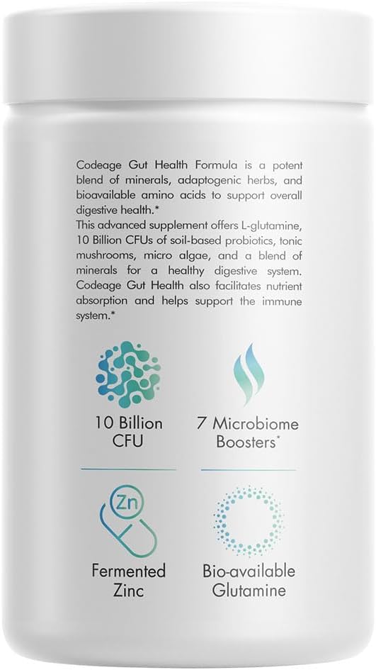BULLET POINTS  :   1 >  GUT FORMULA: Codeage Gut Health Formula is an all-in-one, premium supplement with L-glutamine, zinc, SBO probiotics, prebiotics, turkey tail mushroom, tonic mushroom, maitake, licorice root (DGL), micro algae, minerals and spirulina in an easy and convenient capsule format. 2 months supply