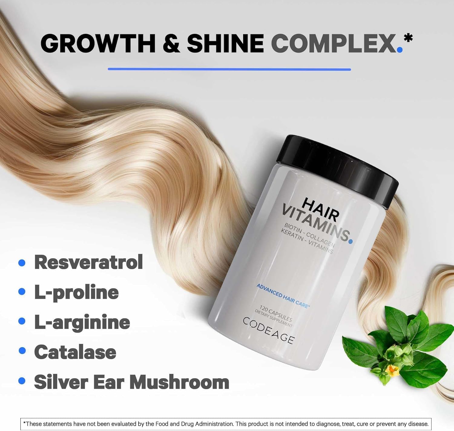Hyaluronic Acid, Resveratrol, Bioperine: Codeage Hair Vitamins Formula Also Includes Hyaluronic Acid, Resveratrol, L-Lysine, L-Proline, And Black Pepper, Thoughtfully Added To Complement The Blend Of Nutrients. This Multivitamin For Hair Formula, Which Includes Vitamin C, Vitamin B6, And Vitamin B12 As Methylcobalamin, Also Features Silver Ear Mushroom And Choline. Codeage Hair Pills Formula Is Designed As A Well-Rounded Blend Of Vitamins And Ingredients To Support Your Daily Hair Care Routine