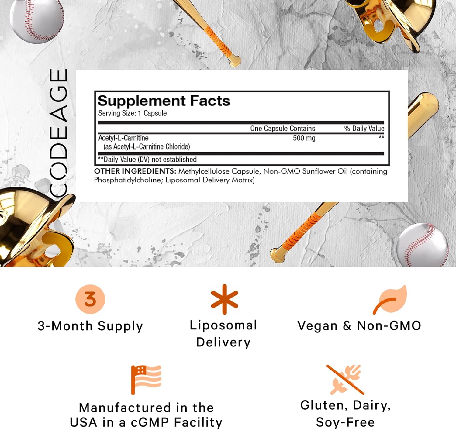 DESCRIPTION : Codeage Liposomal Acetyl-L-Carnitine 500mg Supplement, 3-Month Supply - Liposomal ACL for Enhanced Absorption - Energy, Healthy Brain, Cognitive Support - 1 Capsule a Day, Vegan, Non-GMO, 90 Capsules