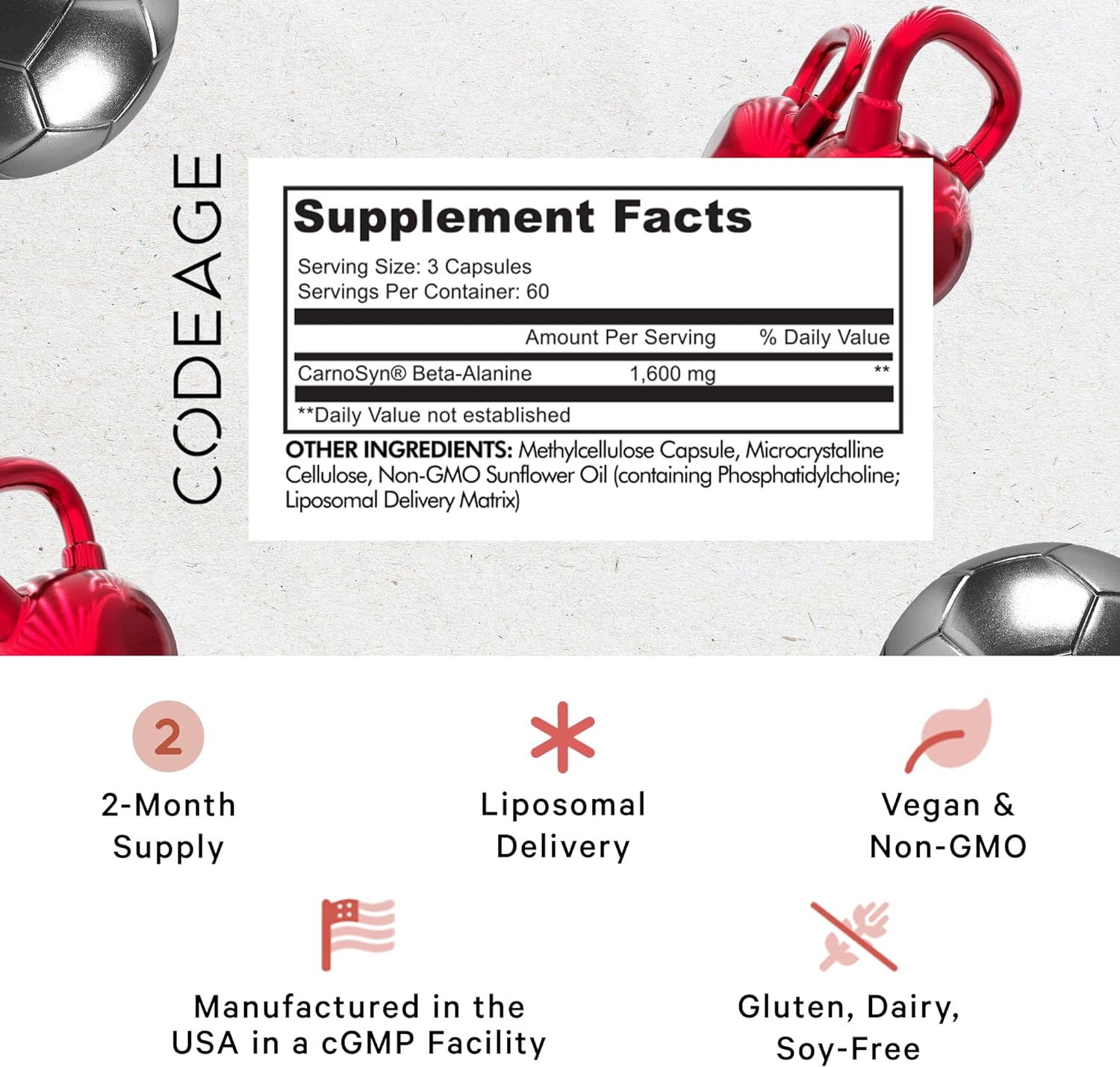 BULLET POINTS  :   1 >  Codeage Liposomal Beta-Alanine+ is a premium supplement for athletes and fitness enthusiasts. Formulated with CarnoSyn Beta-Alanine and featuring a liposomal delivery to help enhance absorption, this beta-alanine supplement is formulated to help support endurance, muscle, and overall athletic performance