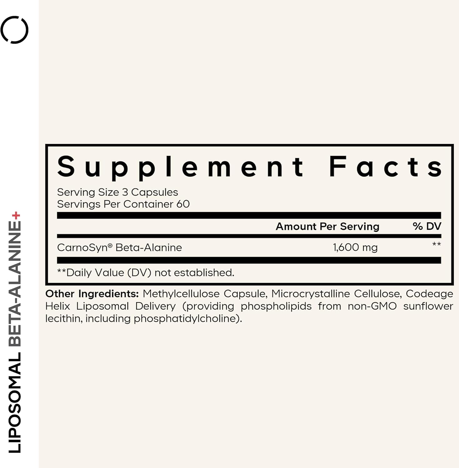 About this item Premium CarnoSyn Beta-Alanine: Codeage Liposomal Beta-Alanine supplement offers a high-quality CarnoSyn Beta-Alanine, a patented form of beta-alanine, ideal for athletes and fitness enthusiasts. Liposomal Delivery : This beta-alanine pre-workout and post-workout supplement features a liposomal formula made with a phospholipid complex utilizing non-GMO sunflower oil for added purity. 2-Month Supply: Each bottle contains 60 servings, providing 2 months of supply. Beta-alanine is a key component related to carnosine. Versatile for Pre and Post-Workout: This B Alanine supplement is suitable for both pre-workout and post-workout routines, making it a flexible addition to your fitness regimen. Manufactured in the USA: Codeage Liposomal Beta-Alanine+ supplement is manufactured in the USA with global ingredients in a cGMP-certified facility for quality and purity. This beta-alanine supplement is non-GMO, vegan, dairy-free, soy-free, gluten-free, and keto-friendly. โบ See more product details,Premium CarnoSyn Beta-Alanine: Codeage Liposomal Beta-Alanine supplement offers a high-quality CarnoSyn Beta-Alanine, a patented form of beta-alanine, ideal for athletes and fitness enthusiasts,Liposomal Delivery : This beta-alanine pre-workout and post-workout supplement features a liposomal formula made with a phospholipid complex utilizing non-GMO sunflower oil for added purity,2-Month Supply: Each bottle contains 60 servings, providing 2 months of supply. Beta-alanine is a key component related to carnosine,Versatile for Pre and Post-Workout: This B Alanine supplement is suitable for both pre-workout and post-workout routines, making it a flexible addition to your fitness regimen,Manufactured in the USA: Codeage Liposomal Beta-Alanine+ supplement is manufactured in the USA with global ingredients in a cGMP-certified facility for quality and purity. This beta-alanine supplement is non-GMO, vegan, dairy-free, soy-free, gluten-free, and keto-friendly