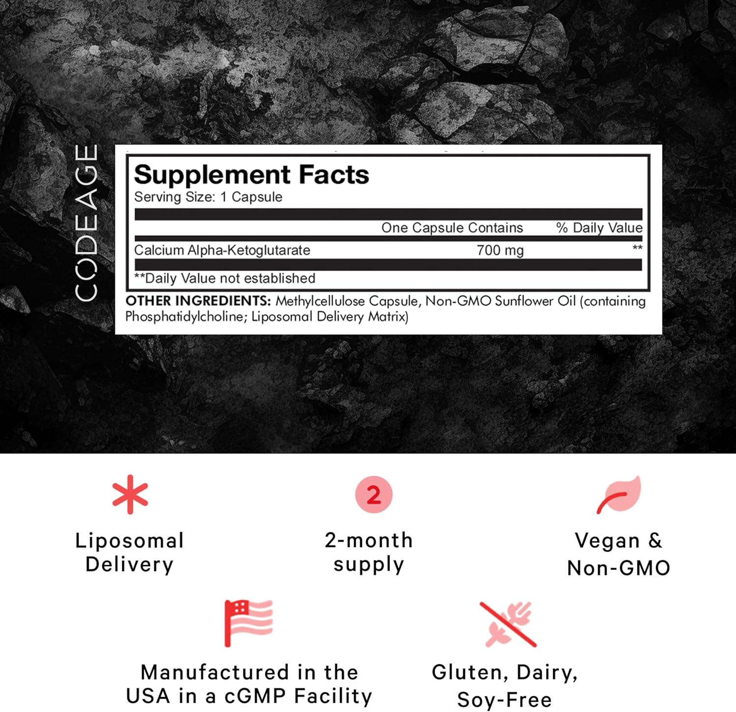 Codeage Liposomal Calcium Akg Supplement - Pure Alpha Ketoglutarate Acid - 2-Month Supply - Liposomal Delivery For Bioavailability - Bone, Energy, Muscle Support, Healthy Aging - Non-Gmo - 60 Capsules