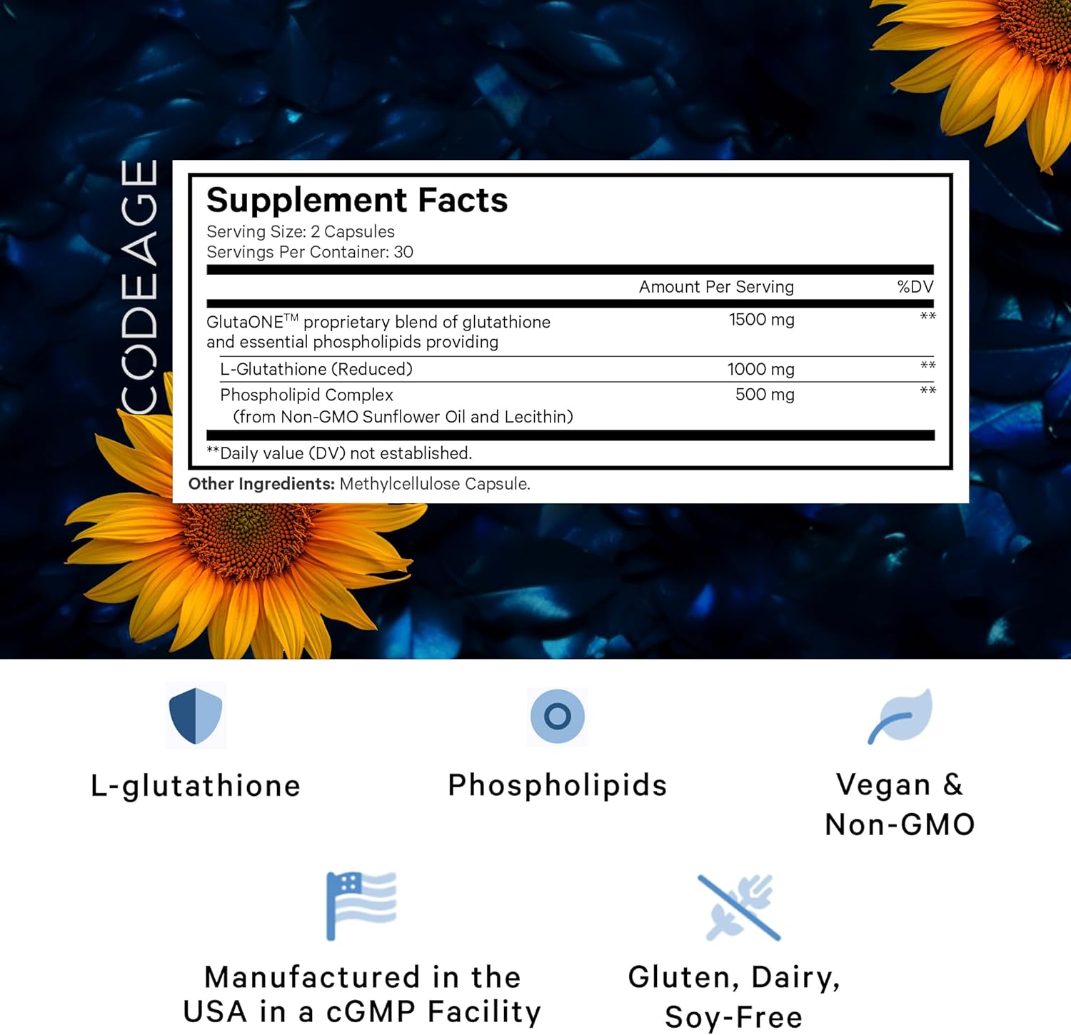 Codeage Liposomal Glutathione 1000 Mg, Glutaone Antioxidant Phospholipid Complex, L-Glutathione Reduced Capsules Supplement, Non-Gmo Sunflower Oil & Lecithin Essential Phospholipids, Vegan, 60 Ct