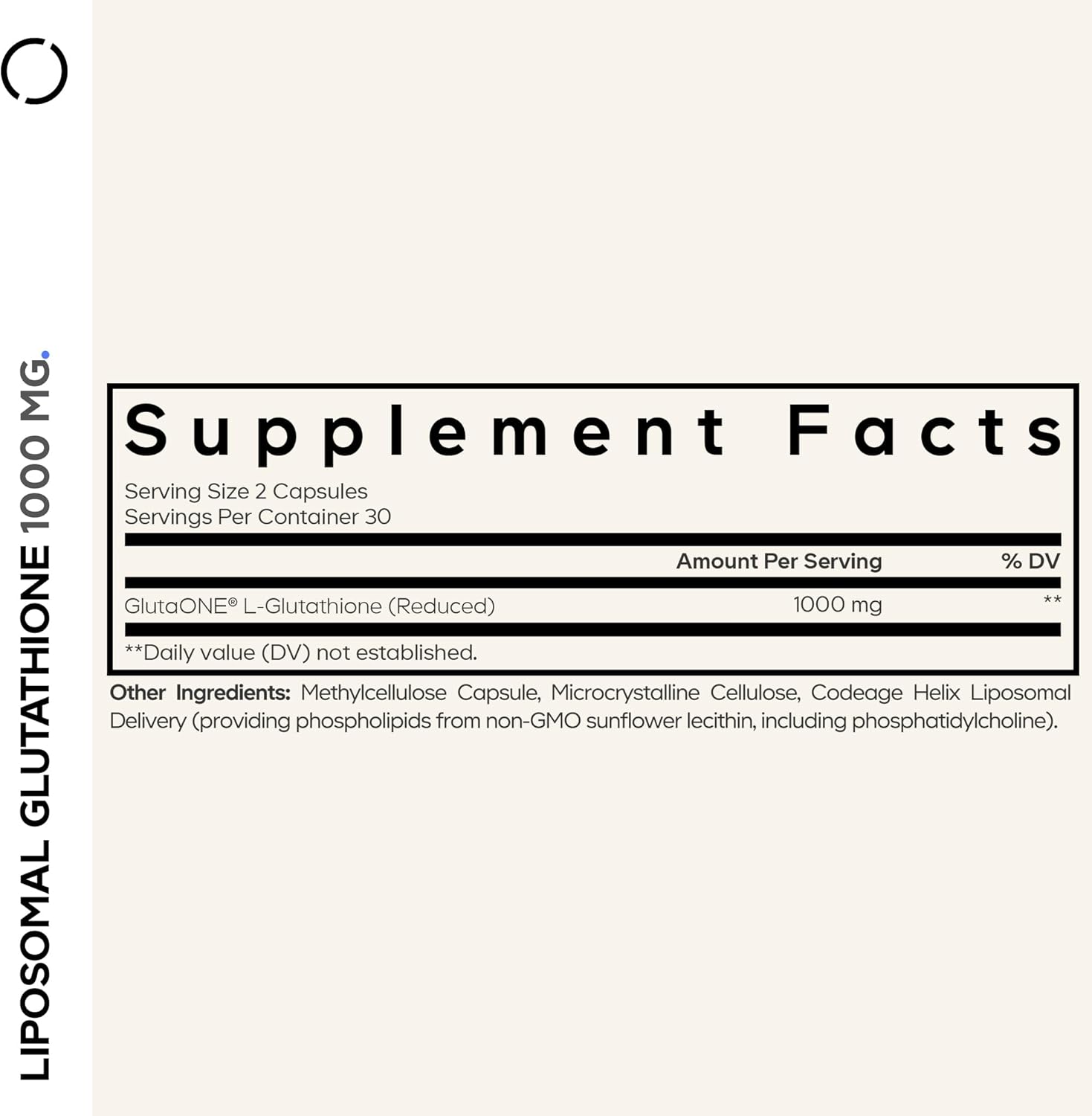 About this item High-Potency L-Glutathione 1000 mg: Codeage Liposomal Glutathione 1000 mg supplement delivers 1,000 mg of reduced glutathione per serving, offering a substantial dose of this important tripeptide composed of three amino acids. Liposomal Delivery: This glutathione formula includes a liposomal formula with a phospholipid complex utilizing non-GMO sunflower lecithin for added purity. Dietary Friendly: This glutathione capsule supplement is vegan, non-GMO, dairy-free, gluten-free, and soy-freeāsuitable for various dietary needs and preferences. Manufactured in the USA: Codeage Liposomal Glutathione 1000 mg supplement is manufactured in the USA in a cGMP-certified facility with no artificial colors or ingredients. Each bottle comes with a 1 month supply. āŗ See more product details,High-Potency L-Glutathione 1000 mg: Codeage Liposomal Glutathione 1000 mg supplement delivers 1,000 mg of reduced glutathione per serving, offering a substantial dose of this important tripeptide composed of three amino acids,Liposomal Delivery: This glutathione formula includes a liposomal formula with a phospholipid complex utilizing non-GMO sunflower lecithin for added purity,Dietary Friendly: This glutathione capsule supplement is vegan, non-GMO, dairy-free, gluten-free, and soy-freeāsuitable for various dietary needs and preferences,Manufactured in the USA: Codeage Liposomal Glutathione 1000 mg supplement is manufactured in the USA in a cGMP-certified facility with no artificial colors or ingredients. Each bottle comes with a 1 month supply
