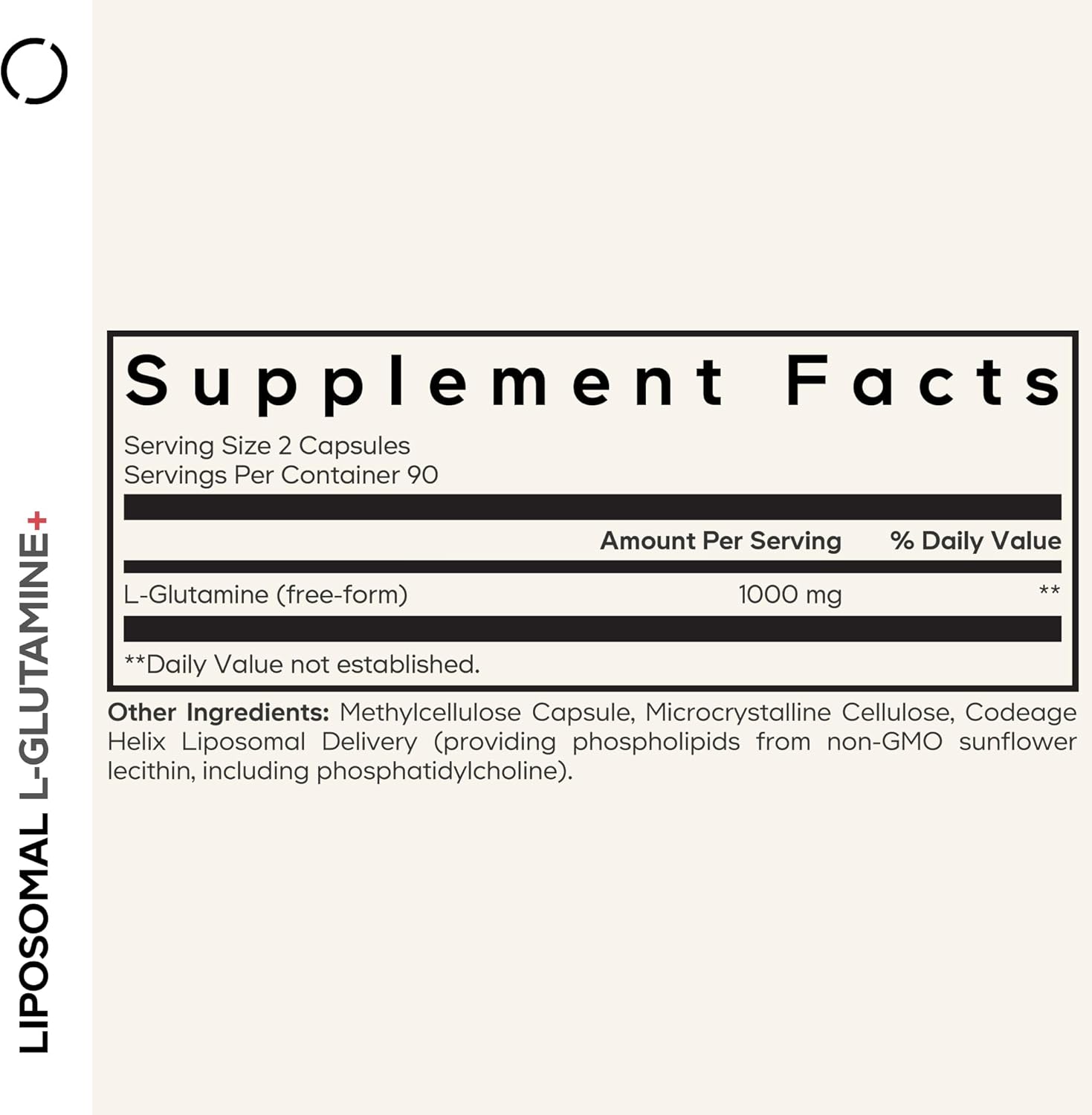 About this item High-Quality L-Glutamine: Codeage Liposomal L-Glutamine supplement provides 1,000 mg of free-form L-Glutamine per serving in convenient capsule form. Liposomal Delivery: This amino glutamine supplement features a liposomal delivery formula made with a phospholipid complex utilizing non-GMO sunflower oil for added purity. 3-Month Supply: Each bottle of this glutamine supplement offers 90 servings for 3 months of supply. Dietary Friendly: Vegan, non-GMO, gluten-free, soy-free, dairy-free, and keto-friendly—suitable for various dietary preferences. Manufactured in the USA: Codeage Liposomal L-Glutamine+ is manufactured in the USA with global ingredients in a cGMP-certified facility for quality and purity. › See more product details,High-Quality L-Glutamine: Codeage Liposomal L-Glutamine supplement provides 1,000 mg of free-form L-Glutamine per serving in convenient capsule form,Liposomal Delivery: This amino glutamine supplement features a liposomal delivery formula made with a phospholipid complex utilizing non-GMO sunflower oil for added purity,3-Month Supply: Each bottle of this glutamine supplement offers 90 servings for 3 months of supply,Dietary Friendly: Vegan, non-GMO, gluten-free, soy-free, dairy-free, and keto-friendly—suitable for various dietary preferences,Manufactured in the USA: Codeage Liposomal L-Glutamine+ is manufactured in the USA with global ingredients in a cGMP-certified facility for quality and purity