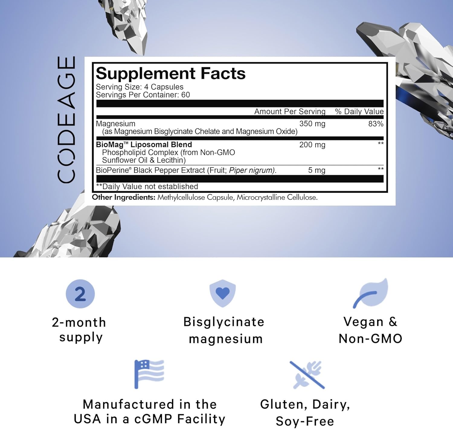 Codeage Liposomal Magnesium Glycinate Supplement, 2-Month Supply, Bisglycinate Magnesium Chelate, Chelated Magnesium Mineral Pills, Bioperine Black Pepper Vitamins Capsules, Non-Gmo Vegan, 240 Ct