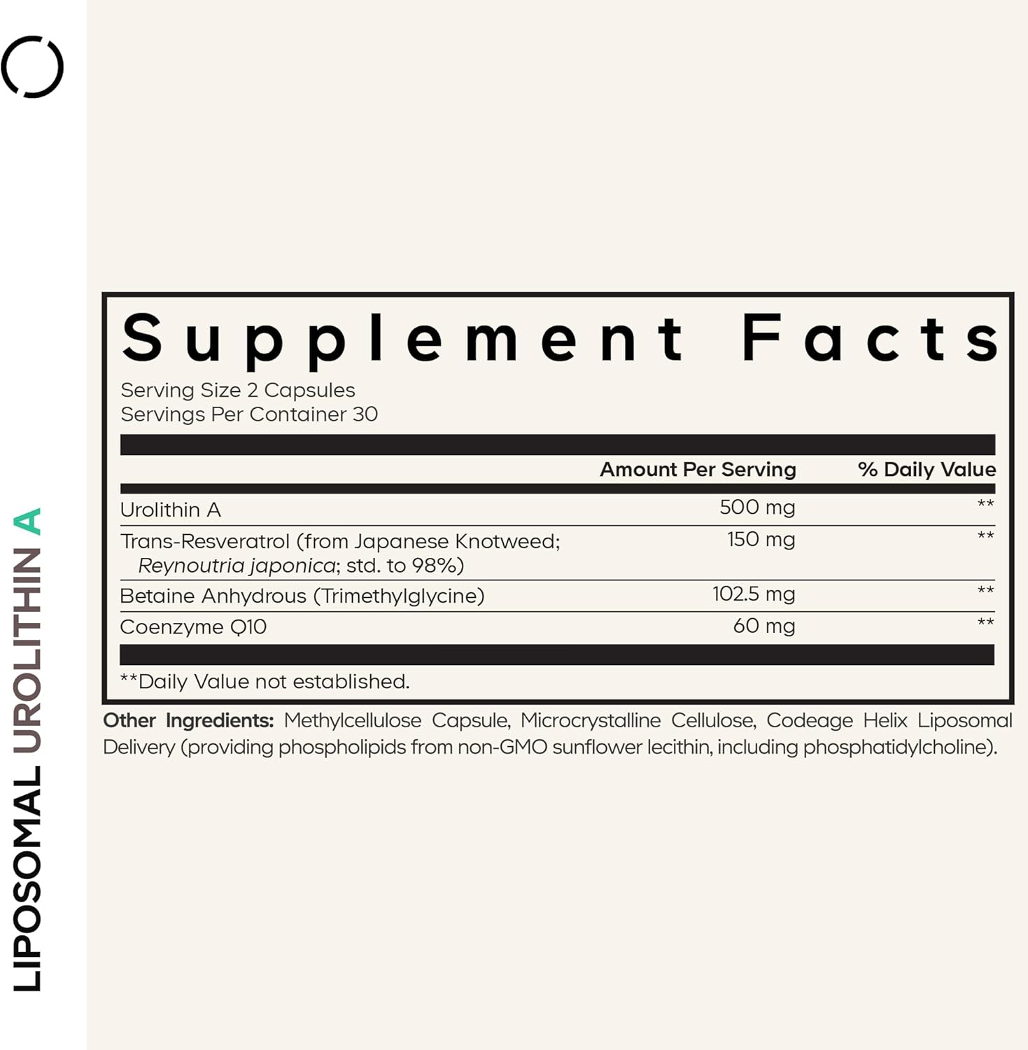 About this item This Urolithin A capsule supplement provides 500mg of Urolithin A per serving and also offers trans-resveratrol from Japanese Knotweed, betaine anhydrous, and CoQ10 for an elevated wellness formula.* This advanced urolithin resveratrol formula also features a liposomal delivery system from non-GMO sunflower oil to help enhance the delivery and absorption of the ingredients.* Urolithin A is a natural metabolite produced by the gut microbiome during the digestion of ellagitannins. Ellagitannins are generally obtained from various fruits and nuts, including pomegranates, strawberries, and walnuts. Codeage Liposomal Urolithin A supplement is non-GMO, gluten-free, soy-free, dairy-free, and keto-friendly, making it a convenient supplement for those with dietary restrictions. It is also vegan-friendly. Codeage Liposomal Urolithin A supplement is manufactured in the USA in a cGMP-certified facility for quality and purity. It also comes with 30 servings per bottle for 1 month of supply. โบ See more product details,This Urolithin A capsule supplement provides 500mg of Urolithin A per serving and also offers trans-resveratrol from Japanese Knotweed, betaine anhydrous, and CoQ10 for an elevated wellness formula,This advanced urolithin resveratrol formula also features a liposomal delivery system from non-GMO sunflower oil to help enhance the delivery and absorption of the ingredients,Urolithin A is a natural metabolite produced by the gut microbiome during the digestion of ellagitannins. Ellagitannins are generally obtained from various fruits and nuts, including pomegranates, strawberries, and walnuts,Codeage Liposomal Urolithin A supplement is non-GMO, gluten-free, soy-free, dairy-free, and keto-friendly, making it a convenient supplement for those with dietary restrictions. It is also vegan-friendly,Codeage Liposomal Urolithin A supplement is manufactured in the USA in a cGMP-certified facility for quality and purity. It also comes with 30 servings per bottle for 1 month of supply
