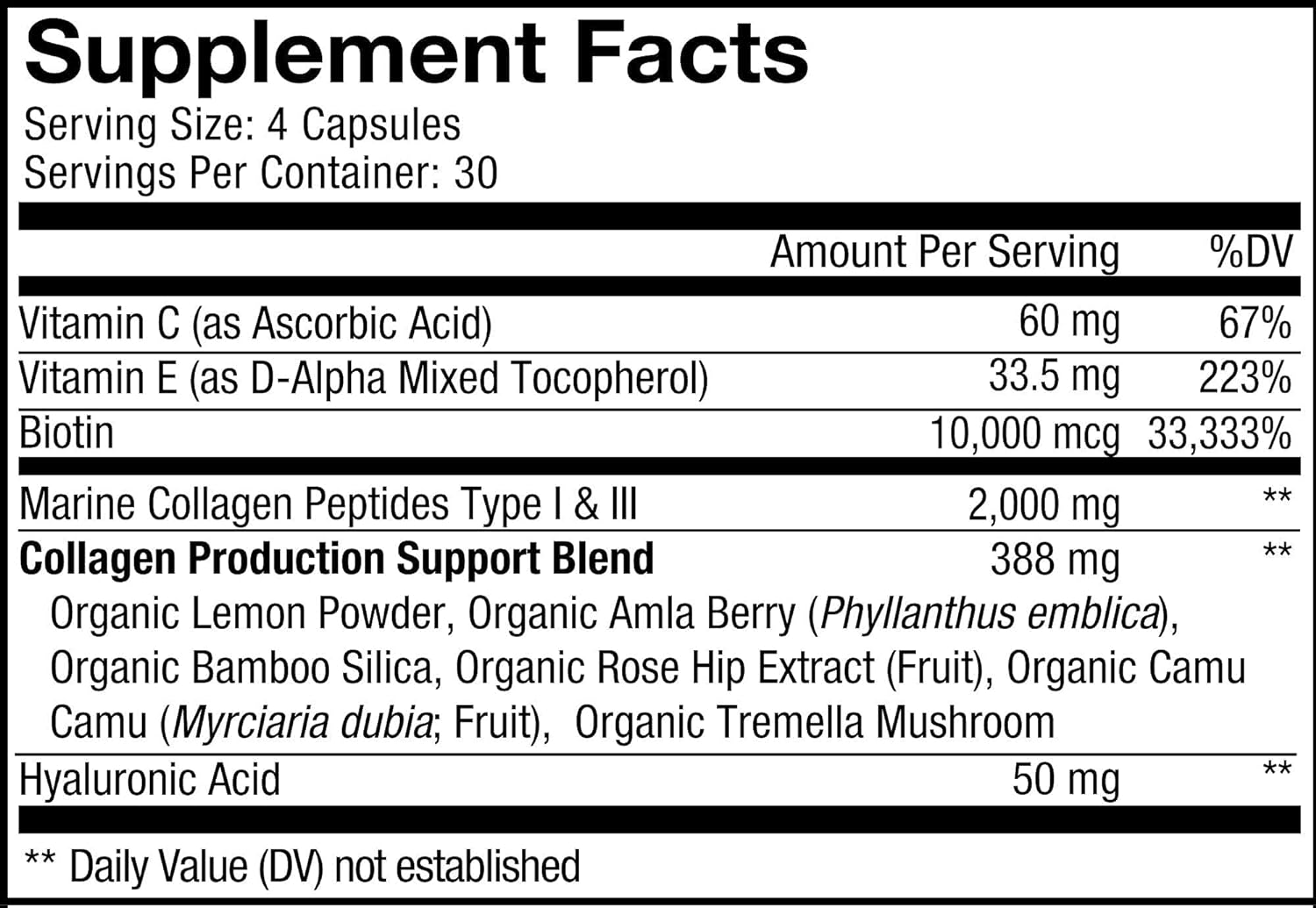 DESCRIPTION : Codeage Marine Collagen Peptides โ Hydrolyzed Fish Collagen Protein Supplement, 10,000mcg Biotin Collagen, Vitamin C, E, Hyaluronic Acid Amino Acid - Hair, Skin, Joint, Wild-Caught Fish - 120 capsules