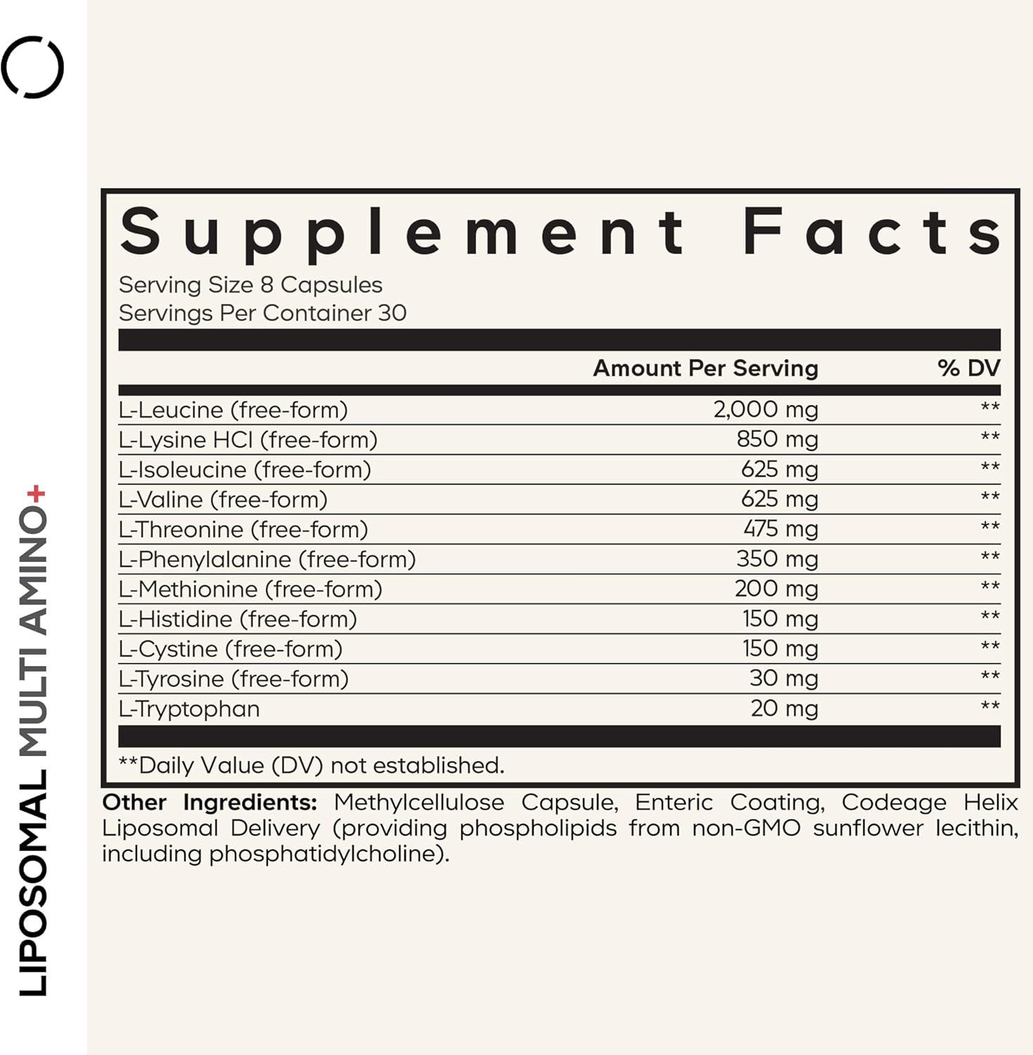 This BCAA (branched-chain amino acid) and EAA (essential amino acid) supplement features a liposomal delivery made with a phospholipid complex utilizing non-GMO sunflower oil for added purity. This EAA supplement formula offers L-Leucine, L-Lysine HCl, L-Isoleucine, L-Valine, L-Threonine, L-Phenylalanine, L-Methionine, L-Histidine, L-Cystine, L-Tyrosine in their free-form as well as L-Tryptophan