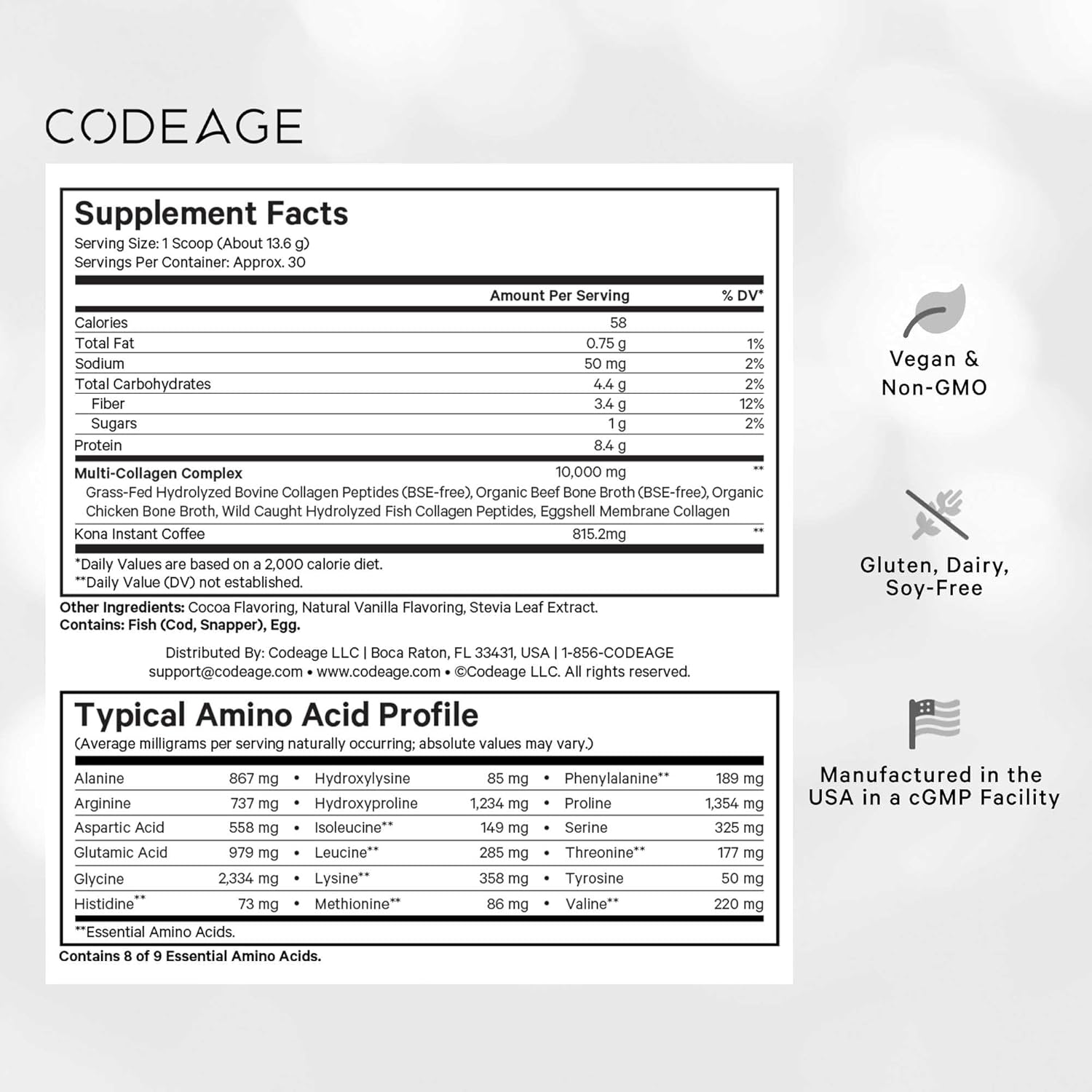 Manufactured in the USA: Codeage Multi Collagen Peptides Powder Mocha is non-GMO, dairy, soy, and gluten-free. This coffee collagen powder supplement is manufactured in the USA with global ingredients in a cGMP-certified facility for quality and purity