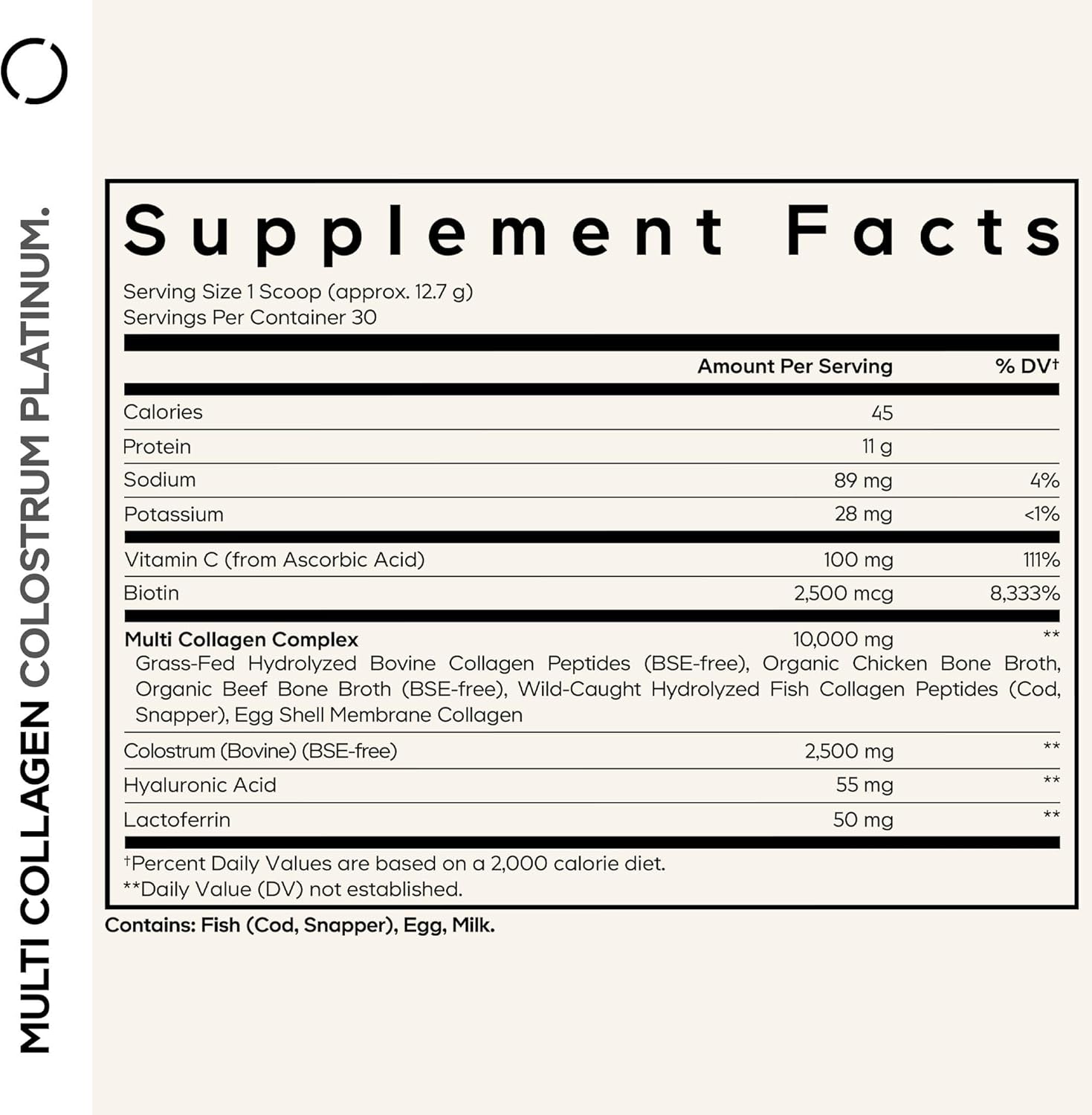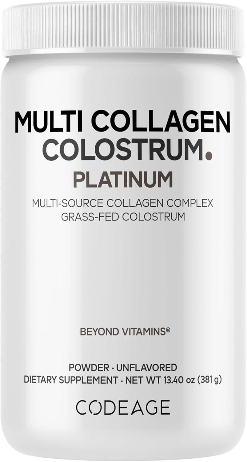 About this item Multi-Source Collagen Complex: Codeage Multi Collagen Colostrum Platinum powder supplement combines collagen peptides from grass-fed and hydrolyzed bovine, organic chicken and beef bone broth, wild-caught fish collagen, and egg shell membrane collagen for a superior daily formula. Premium Colostrum & Lactoferrin: This supplement is enriched with grass-fed bovine colostrum, a nutrient-dense first milk, as well as lactoferrin. Designed for both women and men, this multi collagen powder supplement is unflavored. Biotin & Vitamin C: This premium collagen blend also delivers 2,500 mcg of biotin, vitamin C, and hyaluronic acid. This collagen colostrum powder supplement offers 18 amino acids and conveniently mixes into coffee, tea, smoothies, protein shakes, or any cold or hot drink. Each bottle provides a 1-month supply. Pure & Clean Formula: This multi collagen peptides and colostrum supplement is free from gluten, soy, hormones, and pesticides to help support various dietary preferences. Manufactured in the USA: Codeage Multi Collagen Colostrum Platinum powder is manufactured in the USA in a cGMP-certified facility using globally sourced ingredients for quality and purity. › See more product details,Multi-Source Collagen Complex: Codeage Multi Collagen Colostrum Platinum powder supplement combines collagen peptides from grass-fed and hydrolyzed bovine, organic chicken and beef bone broth, wild-caught fish collagen, and egg shell membrane collagen for a superior daily formula,Premium Colostrum & Lactoferrin: This supplement is enriched with grass-fed bovine colostrum, a nutrient-dense first milk, as well as lactoferrin. Designed for both women and men, this multi collagen powder supplement is unflavored,Biotin & Vitamin C: This premium collagen blend also delivers 2,500 mcg of biotin, vitamin C, and hyaluronic acid. This collagen colostrum powder supplement offers 18 amino acids and conveniently mixes into coffee, tea, smoothies, protein shakes, or any cold or hot drink. Each bottle provides a 1-month supply,Pure & Clean Formula: This multi collagen peptides and colostrum supplement is free from gluten, soy, hormones, and pesticides to help support various dietary preferences,Manufactured in the USA: Codeage Multi Collagen Colostrum Platinum powder is manufactured in the USA in a cGMP-certified facility using globally sourced ingredients for quality and purity