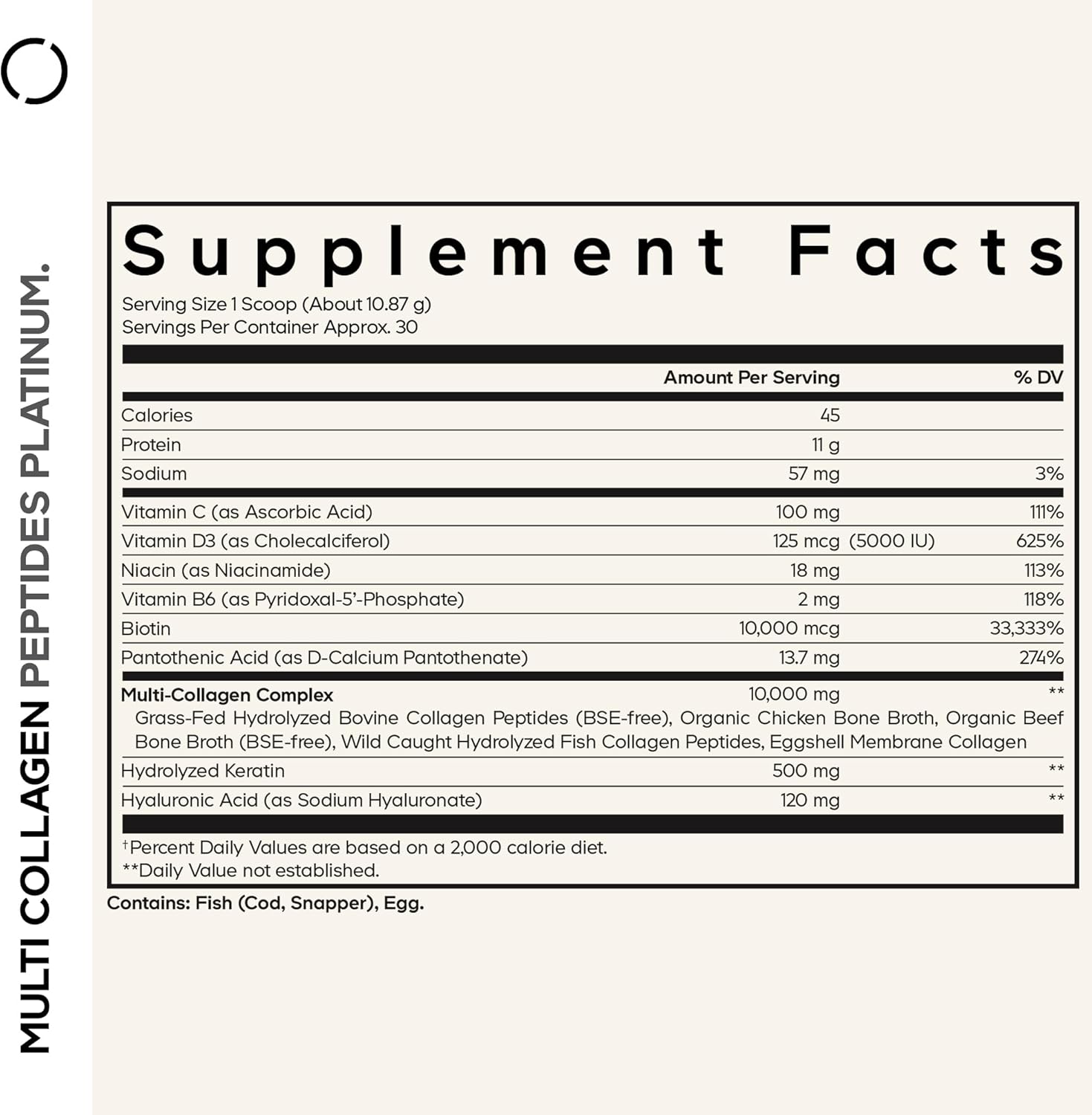 About this item Multi Collagen Peptides Powerhouse: Features 5 types of collagen sourced from premium food sources, including bone broth. This comprehensive multi collagen peptide formula offers a versatile addition to your daily regimen. Biotin 10,000mcg & Hyaluronic Acid Duo: This collagen biotin supplement includes a potent 10,000mcg of Biotin. It also offers Hyaluronic Acid, complemented by Hydrolyzed Keratin, for a multifaceted approach to your supplement routine. Vitamins-Enriched Formula: Enhanced with essential vitamins like Vitamin C, Vitamin D3, Niacin, and Vitamin B6, providing an all-in-one solution for those seeking a convenient addition to their wellness regimen. Easy to Use & Unflavored: This unflavored powder mixes seamlessly into hot or cold beverages, including coffee, tea, smoothies, and protein shakes. Incorporate it effortlessly without altering the taste of your favorite drinks. High-Quality & Pure Ingredients: Codeage Multi Collagen powder Platinum Edition supplement is manufactured in the USA with globally sourced ingredients in a cGMP-certified facility. Non-GMO, free from artificial additives, preservatives, and common allergens like soy, gluten, and dairy. Keto and paleo-friendly, suitable for various dietary preferences. โบ See more product details,Multi Collagen Peptides Powerhouse: Features 5 types of collagen sourced from premium food sources, including bone broth. This comprehensive multi collagen peptide formula offers a versatile addition to your daily regimen,Biotin 10,000mcg & Hyaluronic Acid Duo: This collagen biotin supplement includes a potent 10,000mcg of Biotin. It also offers Hyaluronic Acid, complemented by Hydrolyzed Keratin, for a multifaceted approach to your supplement routine,Vitamins-Enriched Formula: Enhanced with essential vitamins like Vitamin C, Vitamin D3, Niacin, and Vitamin B6, providing an all-in-one solution for those seeking a convenient addition to their wellness regimen,Easy to Use & Unflavored: This unflavored powder mixes seamlessly into hot or cold beverages, including coffee, tea, smoothies, and protein shakes. Incorporate it effortlessly without altering the taste of your favorite drinks,High-Quality & Pure Ingredients: Codeage Multi Collagen powder Platinum Edition supplement is manufactured in the USA with globally sourced ingredients in a cGMP-certified facility. Non-GMO, free from artificial additives, preservatives, and common allergens like soy, gluten, and dairy. Keto and paleo-friendly, suitable for various dietary preferences