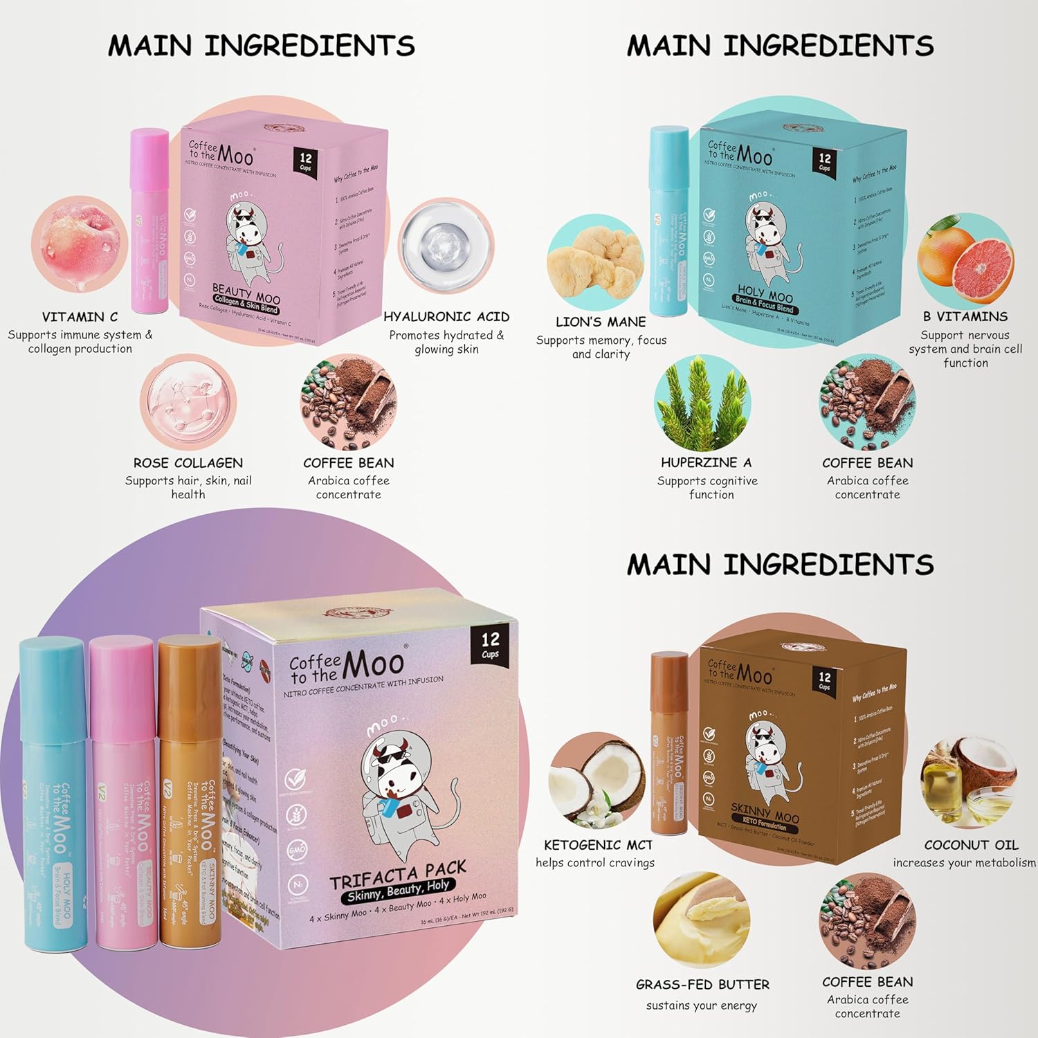 The Complete Coffee Concentrate Pack - Trifacta Pack Offers 4X Skinny Moo, 4X Beauty Moo, And 4X Holy Moo Blends, Catering To Various Lifestyles And Wellness Goals Like Boosting Brain Functions, Or Improving Your Hair, Skin, And Nails
