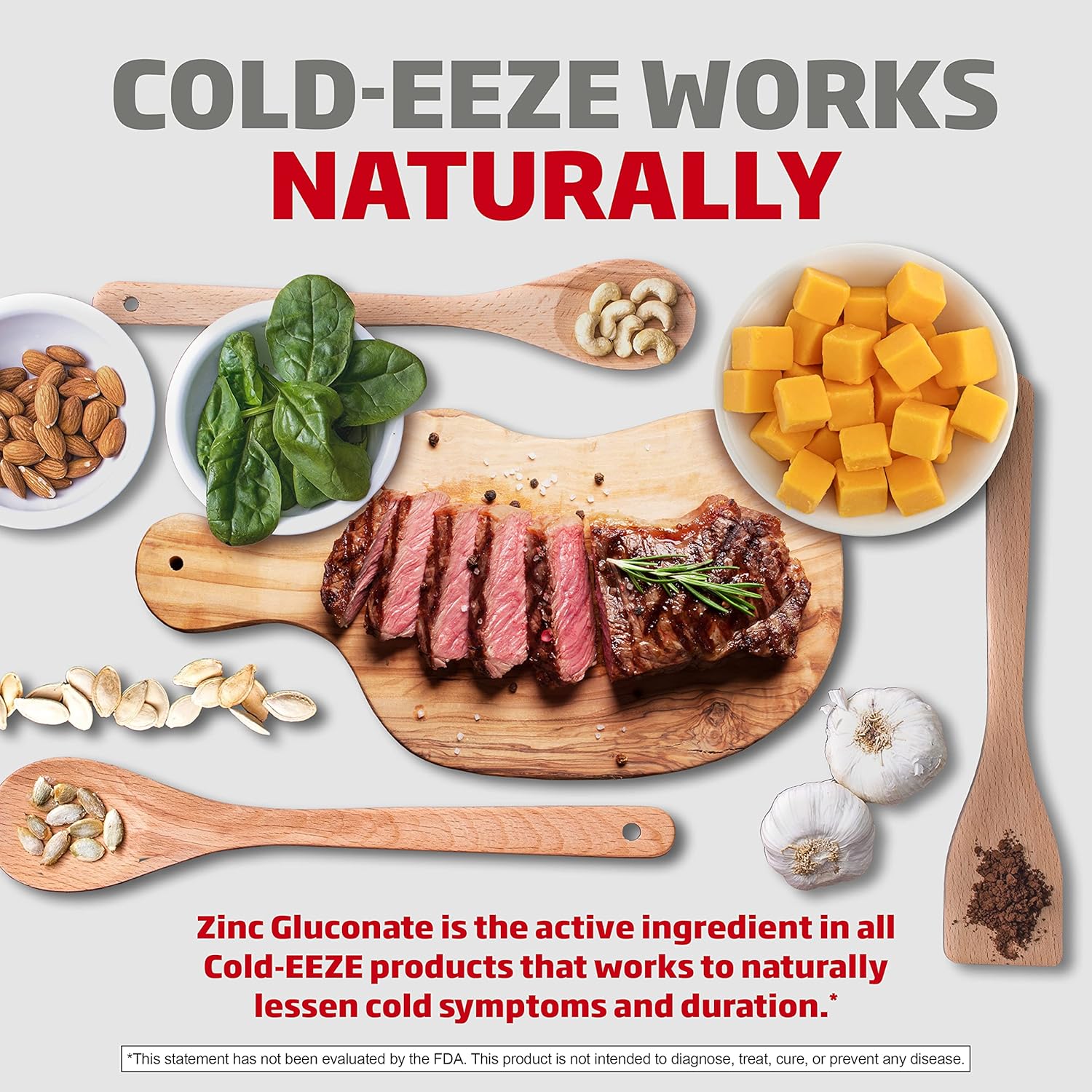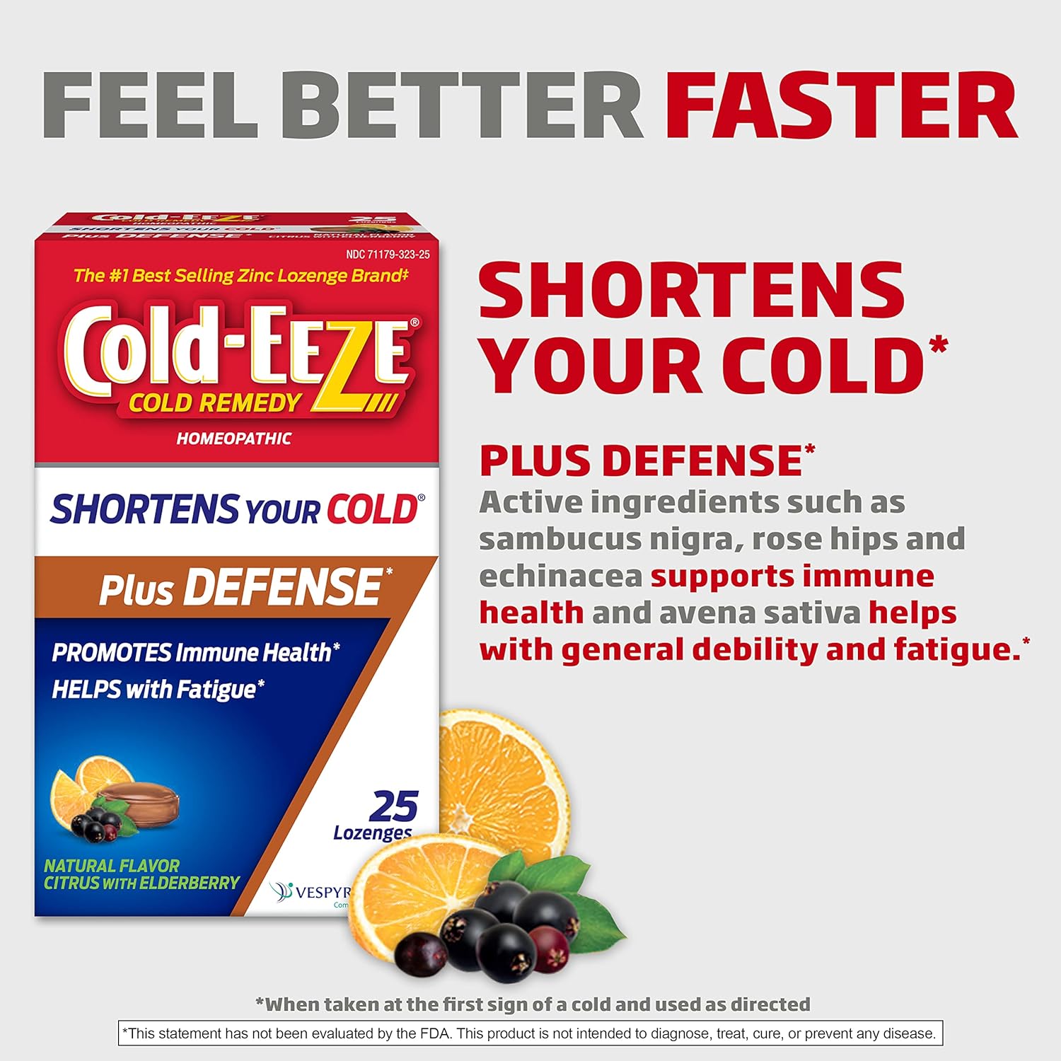About this item Shortens Your Cold: The Cold-EEZE clinically tested zinc gluconate formula can shorten the duration of the common cold by 42% when taken at the first sign of symptoms and used as directed Promotes Immune Health: Each lozenge contains the active ingredients sambucus nigra, rose hips, and echinacea to promote immune health Starts Working Immediately: Cold-EEZE zinc lozenges release zinc ions in the mouth immediately; some scientists believe the release of zinc ions inhibit the cold virusā ability to replicate, shortening the duration of the common cold All-Natural Homeopathic Cold Lozenges: Cold-EEZE Plus Defense lozenges are deliciously natural, vegan, kosher, and contain no artificial colors or preservatives #1 Best-Selling Zinc Lozenge Brand: Cold-EEZE zinc lozenges have been a trusted first line of defense against colds since 1996 and are Pharmacist recommended For Adults and Children 12 Years+: Reduces the duration of the common cold and the severity of cold symptoms, including cough, sore throat, nasal congestion, post nasal drip, and/or hoarseness āŗ See more product details,Shortens Your Cold: The Cold-EEZE clinically tested zinc gluconate formula can shorten the duration of the common cold by 42% when taken at the first sign of symptoms and used as directed,Promotes Immune Health: Each lozenge contains the active ingredients sambucus nigra, rose hips, and echinacea to promote immune health,Starts Working Immediately: Cold-EEZE zinc lozenges release zinc ions in the mouth immediately; some scientists believe the release of zinc ions inhibit the cold virusā ability to replicate, shortening the duration of the common cold,All-Natural Homeopathic Cold Lozenges: Cold-EEZE Plus Defense lozenges are deliciously natural, vegan, kosher, and contain no artificial colors or preservatives,#1 Best-Selling Zinc Lozenge Brand: Cold-EEZE zinc lozenges have been a trusted first line of defense against colds since 1996 and are Pharmacist recommended,For Adults and Children 12 Years+: Reduces the duration of the common cold and the severity of cold symptoms, including cough, sore throat, nasal congestion, post nasal drip, and/or hoarseness