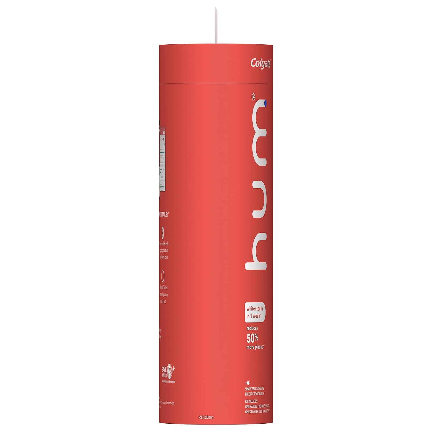 The hum by Colgate Smart Electric and Rechargeable Toothbrush for adults with Bluetooth connectivity guides you to brush better by tracking the frequency, duration, and coverage of your individual brushing style to help you target spots that need extra love. This Amazon exclusive Starter Kit includes a sonic electric toothbrush handle and head, charger, travel case, and an extra refill head (as part of the Amazon exclusive kit) so your brush heads are as fresh as your mouth for up to 6 months. Start by downloading the hum by Colgate app on the Apple app store or Google Play Store. Choose which cleaning mode you prefer for your teeth and gums. This vibrating toothbrush features 3 sonic vibration settings which include normal, sensitive, and deep clean modes that also work to brush teeth with braces. The travel case makes it easier to take this portable toothbrush on your next vacation or even to work. Rest easy knowing the rechargeable battery can last 10 days. The app will show you how much coverage you reached during each session and what parts of your mouth you may have missed. When you need more replacement toothbrush heads, Amazon Alexa can let you know when you need them or you can set up smart reorders so you always have brush heads when needed. With a brush that knows you and an app that shows you, hum smart toothbrush makes seriously good oral care something to smile about with fun activities and challenges that help you improve your brushing while earning points toward rewardsStarter Kit includes: 1 smart electric adult toothbrush handle and head, 1 charger, 1 carrying case and an extra refill brush head keep you humming for up to 6 monthsSmart toothbrush guides you to brush better: Connected, Bluetooth toothbrush targets spots that need extra love.Material: ABS (Acrylonitrile Butadiene Styrene)Powerful sonic vibrations in 3 modes: Personalize your pulse by choosing the vibration level that suits you; choose from normal, sensitive, or deep cleanWin-win situation: hum your way to clean with our sonic toothbrush and improve your brushing while earning points toward rewards