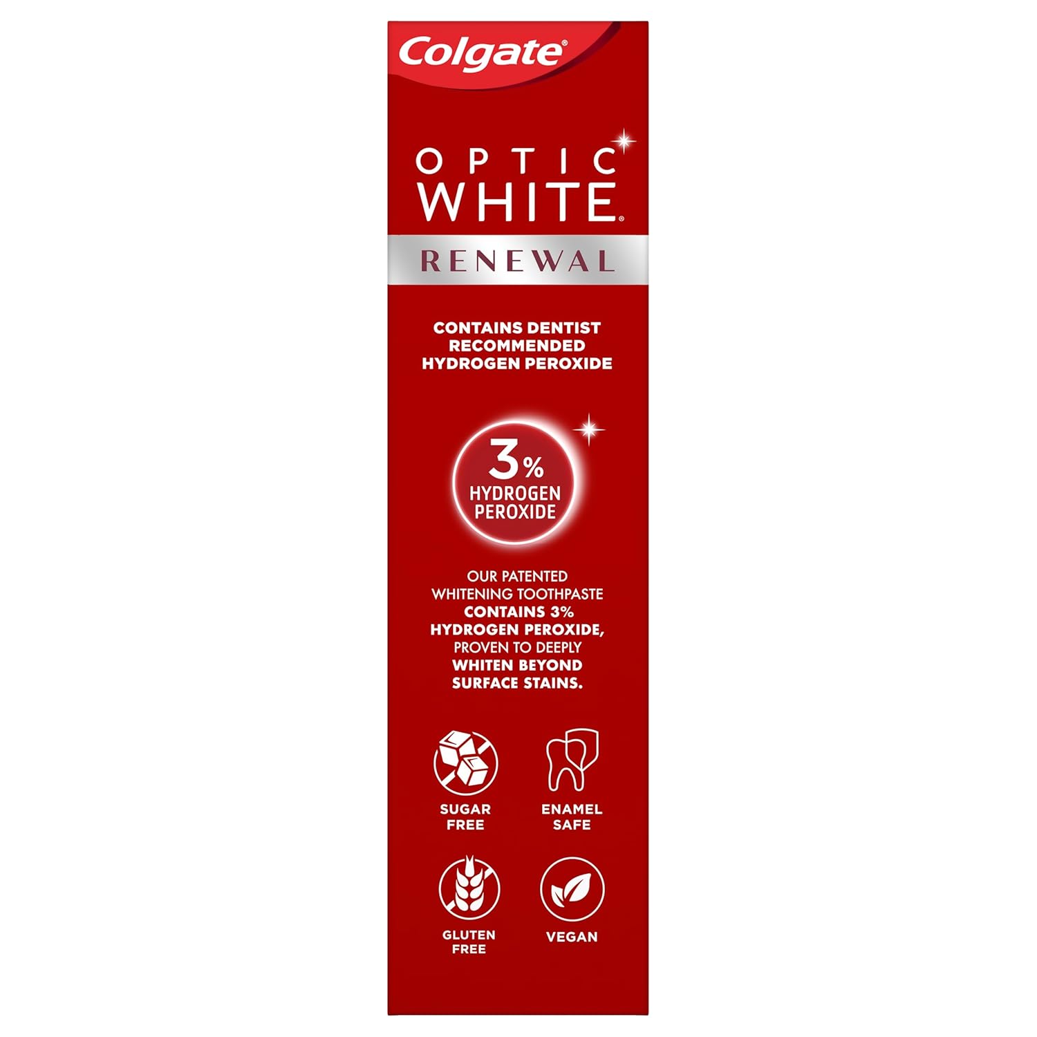 Colgate Optic White Renewal Is Whitening That Works. Get 10X Whiter Teeth* With This Teeth Whitening Toothpaste, Which Contains Dentist Recommended Hydrogen Peroxide. With A Patented 3% Hydrogen Peroxide Formula Which Deeply Whitens Beyond Surface Stains, This Hydrogen Peroxide Toothpaste Not Only Removes Surface Stains, But Also Can Penetrate To Work Below The Tooth Surface. Colgate Optic White Renewal Toothpaste, Enamel Strength, Is A Mint Toothpaste That Has A Refreshing Mint Flavor That Freshens Breath. It Is Also An Anticavity Fluoride Toothpaste That Helps To Protect Against Cavities. Enamel-Safe For Daily Use, Add This Colgate Whitening Enamel Toothpaste To Your Oral Care Routine For Teeth Whitening That Safely Whitens The Inside As Well As The Outside Of Your Teeth. Colgate Optic White Renewal Whitening And Stain Removal Toothpaste Is A Vegan Toothpaste ThatāS Also Gluten-Free And Sugar-Free. For Good Oral Hygiene, Brush Your Teeth Twice A Day For Two Minutes. Optic White Toothpaste Is Made By Colgate, The Brand That Knows The Power Of A Healthy Smile. *Vs. A Fluoride Toothpaste Without Hydrogen Peroxide, After 4 Weeks Of Use As Directed