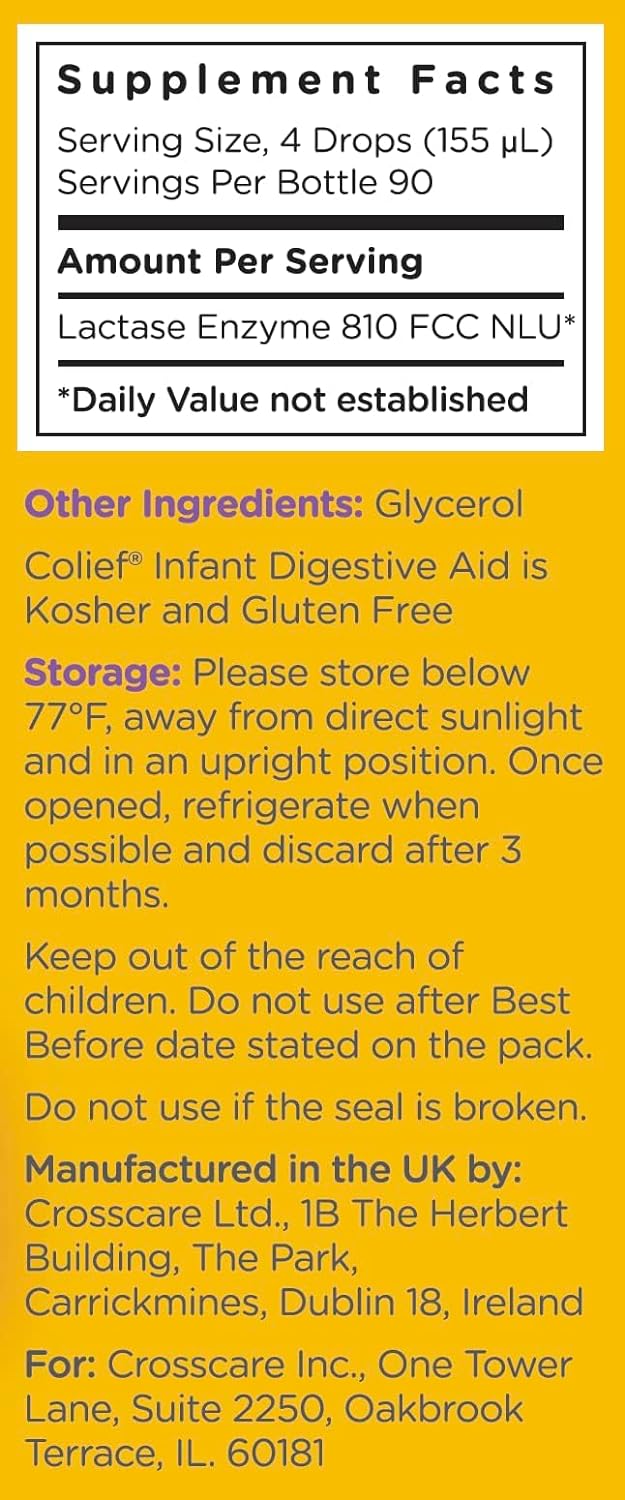 COULD IT BE COLIC Is your baby crying or fussing a lot Up to 1 in 5 babies can suffer from colic, which is defined as repeated episodes of excessive and inconsolable crying in a new-born baby who otherwise appears to be perfectly healthy10100% NATURAL – A safe and natural product, offering gentle colic relief for babies, caused by temporary lactose intolerance. It relieves digestive discomfort, bloating and wind caused by undigested lactose in food10EASY-TO-USE – Colief Infant Digestive Aid contain lactase enzymes, which break down lactose in breast and infant formula. Adding a few drops to your baby’s usual milk reduces the amount of lactose, making the milk easier to digest10SUITABLE FROM BIRTH – Our colic drops are suitable for use from birth and can be used every time you breast feed or formula feed your baby10TRIED & TRUSTED – Colief Infant Digestive Aid is one of the most prescribed products for colic relief in the UK and has been trusted by parents and recommended by healthcare professional for over 25 years