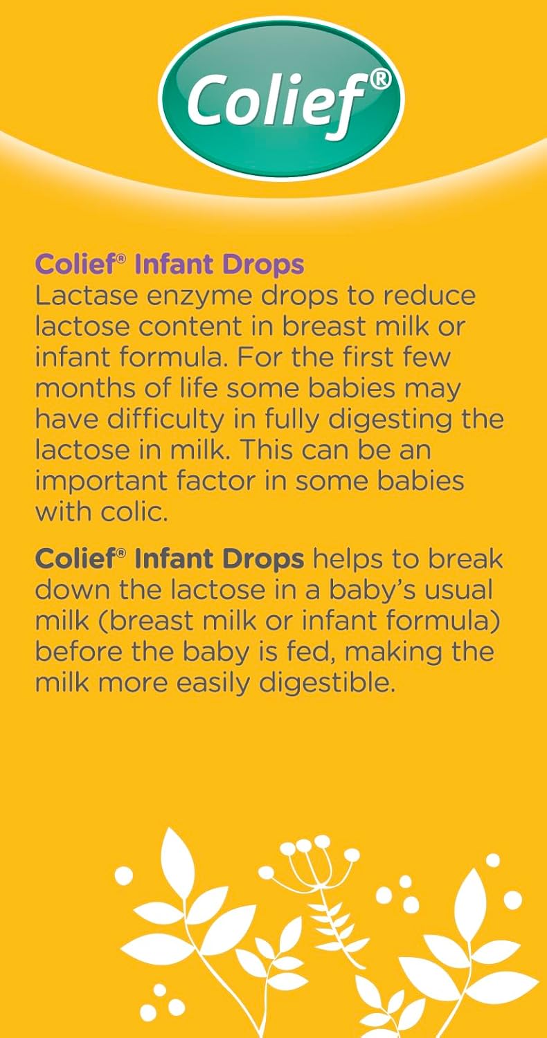 Colief Infant Drops contain lactase enzymes, which break down lactose in cow’s milk, breast milk, infant formulas, and other dairy products; Adding a few drops to your baby’s usual milk reduces the amount of lactose, making the milk easier to digest
