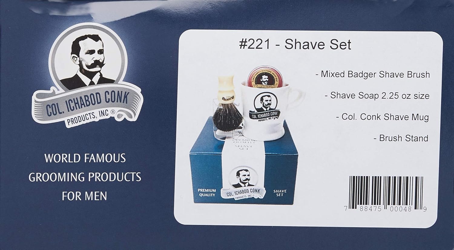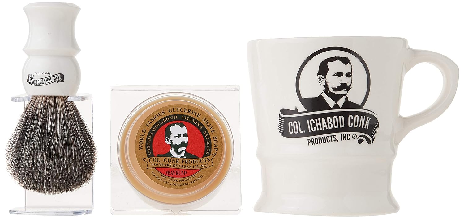 About this item Mixed badger shave brush with stand Deluxe boar brush hand made on the Isle of Man 2.25 oz. Colonel Conk's world-famous glycerin shave soap The soap scents and colors may vary between Almond, Bayrum, Amber and Lime › See more product details,Mixed badger shave brush with stand,Deluxe boar brush hand made on the Isle of Man,2.25 oz. Colonel Conk's world-famous glycerin shave soap,The soap scents and colors may vary between Almond, Bayrum, Amber and Lime