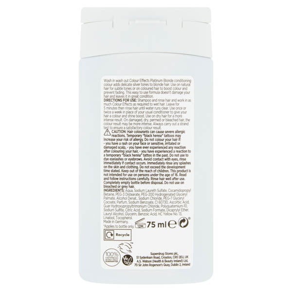 Product Information:Colour Effects Wash In Wash Out Is A Gentle And Easy To Use Conditioning Colour. Give A Colour Boost To Coloured Hair Or Add Beautiful Subtle Tones To Natural Hair,Features:⢠Colours And Conditions Your Hair In 1 Easy Step. ⢠Adds Delicate Silver Tones To Blonde Hair. ⢠Use On Natural Hair For Subtle Tones. ⢠Use On Coloured Hair To Enhance Colour And Prevent Fading. ⢠Boosts Shine And Doesn'T Damage Your Hair. ⢠Each Bottle Contains Up To 3 Applications. ⢠Vegan,Warning Or Restrictions:On Damaged, Dry, Permed Or Bleached Hair, The Colour Result May Be More Intense. Always Carry Out A Strand Test To Ensure A Satisfactory Colour Result. Caution: Hair Colourants Can Cause Severe Allergic Reactions. Temporary āBlack Hennaā Tattoos May Increase Your Risk Of Allergy. Do Not Colour Your Hair If: - You Have A Rash On Your Face Or Sensitive, Irritated Or Damaged Scalp, - You Have Ever Experienced Any Reaction After Colouring Your Hair, - You Have Experienced A Reaction To A Temporary āBlack Hennaā Tattoo In The Past. Do Not Use To Dye Eyelashes Or Eyebrows. Avoid Contact With Eyes, Rinse Immediately If Contact Occurs. Immediately Rinse Any Splashes On The Skin And Clothing. Do Not Exceed The Development Time Stated. Keep Out Of The Reach Of Children. This Product Is Not Intended For Use On Persons Under The Age Of 16. Read And Follow Instructions Carefully. Rinse Hair Well After Use. Completely Empty Bottle Before Disposal. Do Not Use On Bleached Or Grey Hair,Product Specification:Aqua, Sodium Laureth Sulfate, Cocamidopropyl Betaine, Peg-3 Distearate, Peg-200 Hydrogenated Glyceryl Palmate, Alcohol Denat., Sodium Chloride, Peg-7 Glyceryl Cocoate, Parfum, Sodium Benzoate, Ci 60730, Ascorbic Acid, Guar Hydroxypropyltrimonium Chloride, Polyquaternium-10, Sodium Sulfite, Citric Acid, Sodium Formate, Dicaprylyl Ether, Lauryl Alcohol, Glycerin, Benzoic Acid, Hc Yellow No. 13, Linalool, Tocopherol,Product Uses:Shampoo And Rinse Hair And Work In As Much Colour Effects As Required To Wet Hair. Leave For 5 Minutes Then Rinse Hair Until Water Runs Clear,Recyclable:Bottle - Recycle. Made From 30% Recycled Plastic,Tips And Advice:Use Once Or Twice A Week In Place Of Your Usual Conditioner To Give Your Hair A Colour And Shine Boost. For A More Intense Result, Use On Dry Hair
