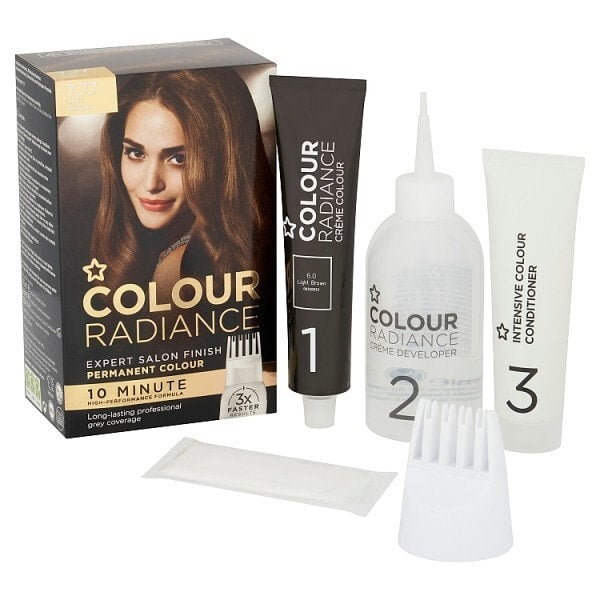 Product Information:Get Salon Quality Permanent Colour At Home With Superdrug Colour Radiance. Designed To Penetrate The Hair Faster For Exceptional Results In 10 Minutes, ItâS Easy To Achieve Long-Lasting Grey Coverage With This High-Performance Formula. The Precision Application Comb Allows Easy Distribution Of Rich, Multi-Tonal Colour From Root To Tip For Radiant Results Every Time,Features:¡ Permanent. 3X Faster Results* And Long-Lasting Grey Coverage. ¡ Quick And Easy Application. Includes Precision Comb For Effortless Colour. ¡ Professional Formula. Salon Tested. Vegan. ¡ New Formulations Including Intensive Colour Conditioner With Triple Oil Blend**, Wheat Protein And Niacinamide. Specifically Formulated To Help Strengthen Coloured Hair With Up To 90% Less Breakage***. Designed To Be Used Week After Week To Leave Freshly Coloured Hair Feeling Soft And Silky With A Radiant Shine. *Compared To A Traditional 30-Minute Hair Colourant. **Contains Babassu, Coconut And Black Castor Oils. ***Instrumental Testing. Measured As Breakage From Multiple Combing,Warning Or Restrictions:Caution: Hair Colourants Can Cause Severe Allergic Reactions. Read And Follow The Instructions Carefully. Conduct A Skin Allergy Test 48 Hours Before Each Time You Colour, Even If You Have Already Used Colouring Products Before, So Remember To Buy The Product 48 Hours In Advance. Do Not Colour Your Hair If: You Have A Rash On Your Face Or Sensitive, Irritated And Damaged Scalp; You Have Ever Experienced Any Reaction After Colouring Your Hair; You Have Experienced A Reaction To A Temporary Black Henna Tattoo In The Past. In These Cases, A Doctor Should Be Consulted Before Using Any Hair Colour Product. Do Not Use To Dye Eyelashes, Eyebrows, The Beard, Pubic Hair Or Any Other Body Hair - Intended Only For Colouring Scalp Hair. Avoid Contact With Eyes. Rinse Eyes Immediately If Product Comes Into Contact With Them. Keep Out Of Reach Of Children,Product Specification:Crème Colour: Aqua, Cetearyl Alcohol, Sodium Laureth Sulfate, Laureth-3, Glyceryl Stearate Se, Ammonia, Toluene-2,5-Diamine Sulfate, Sodium Sulfate, Decyltetradecanol, 2-Methylresorcinol, Sodium Sulfite, Parfum, Ascorbic Acid, Resorcinol, Etidronic Acid, 2-Amino-6-Chloro-4-Nitrophenol, M-Aminophenol, 4-Amino-2-Hydroxytoluene, Sodium Hydroxide. Crème Developer: Aqua, Hydrogen Peroxide, Acetaminophen, Etidronic Acid, Phosphoric Acid. Intensive Colour Conditioner: Aqua, Cetearyl Alcohol, Distearoylethyl Hydroxyethylmonium Methosulfate, Dicaprylyl Ether, Glycerin, Distearyldimonium Chloride, Behentrimonium Chloride, Panthenol, Cetrimonium Chloride, Dicaprylyl Carbonate, Phenoxyethanol, Parfum, Isopropyl Palmitate, Isopropyl Alcohol, Cocos Nucifera Oil, Niacinamide, Orbignya Oleifera Seed Oil, Ricinus Communis Seed Oil, Hydrolyzed Wheat Protein, Hexyl Cinnamal, Hydroxypropyl Guar Hydroxypropyltrimonium Chloride, Tocopherol, Limonene, Citric Acid, Linalool, Citronellol, Sodium Benzoate, Sodium Hydroxide, Glycine Soja Oil, Helianthus Annuus Seed Oil,Product Uses:1. Mix The Crème Colour And Developer Together. 2. Apply And Leave To Develop For 10 Minutes. 3. Rinse And Condition For Radiant Colour,Recyclable:Carton - Recycle Bottle - Recycle Cap On Tube - Recycle Cap On