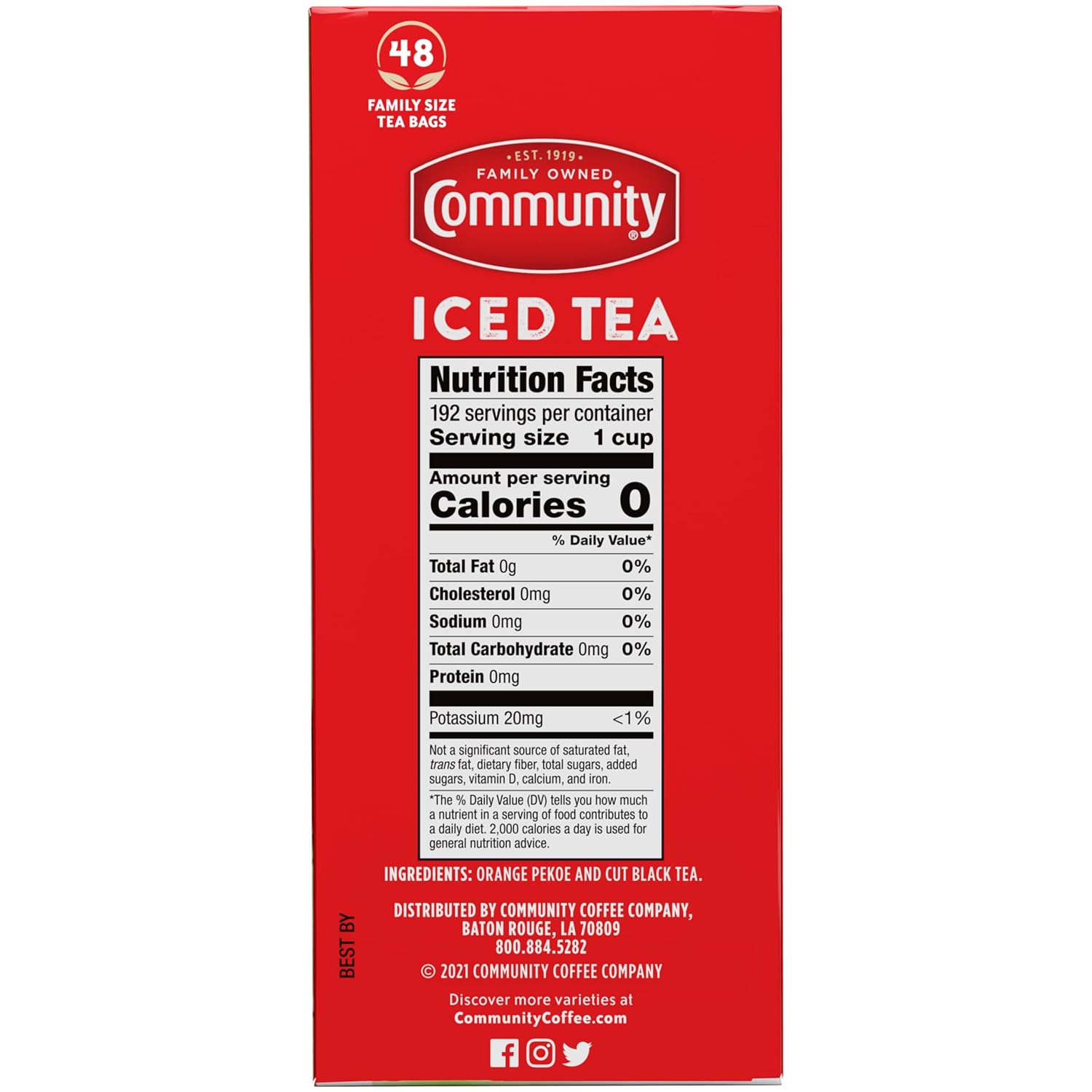 Crisp & Refreshing. Experience Our Signature Iced Tea, A Smooth And Captivating Blend Of The Finest Orange Pekoe And Pekoe Cut Black Tea Specially Blended For Iced Tea. [48 Quart-Sized Tea Bags, Pack Of 12] For Great-Tasting Tea, Follow The Directions Below. Serve With Mint, Lemon Or Sweeten To Personalize. Iced Tea Use 1 Family Size Tea Bag For Each Quart Of Fresh Water. Bring Water To A Boil, Pour Over Tea Bags, Cover And Steep For 3 To 5 Minutes. Remove Tea Bags, Chill And Serve Over Ice. Quick-Serve Pitcher Use 2 Tea Bags For Each Quart Of Fresh Water. Bring Water To A Boil, Pour Over Tea Bags, Cover And Steep For 3 To 5 Minutes. Remove Tea Bags, Add An Equal Amount Of Cold Water And Pour Into Ice-Filled Glasses. About Community Coffee Since Cap Blended The First Batch Of Community® Coffee, We’Ve Seen Plenty Of Change — Both Inside And Outside The Company. We’Ve Evolved To Better Serve Our Customers, But We’Ve Also Tried To Stay True To Our Roots And The Community That Got Us Started. That’S Why For Over 100 Years We’Ve Maintained An Unwavering Dedication To Making The Best-Tasting, Highest-Quality Coffee We Possibly Can — All While Developing Better Methods Of Sourcing, Superior Roasting Techniques And Innovative Ideas To Keep Our Coffee At Its Peak Of Flavor And Freshness. We Simply Love Making Coffee, And We Find Inspiration In Every Part Of The Process, From Planting The Beans To Serving The Perfect Cup. Above All, We'Re Inspired By The People We Work With, The Customers We Serve And The Connections We’Ve Built Together
