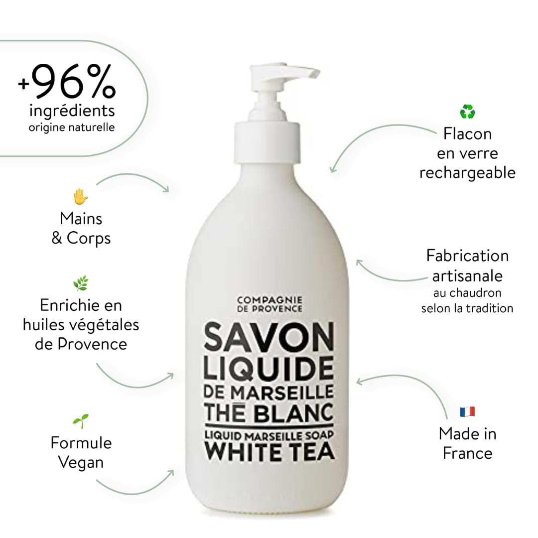 About this item LUXURIOUS LIQUID MARSEILLE SOAP ? Expertly crafted in Provence, France using traditional Savon de Marseille techniques, offering a high-quality, luxurious hand wash and body wash. SIZE ? 16.7 Fl Oz glass bottle (pump dispenser); MOISTURIZING & NOURISHING FORMULA ? Infused with olive oil, coconut oil, and botanical extracts, this hydrating liquid soap cleanses gently while keeping skin soft and moisturized. REFRESHING WHITE TEA FRAGRANCE ? Enjoy a delicate blend of white tea, citrus, and subtle floral notes, creating a calming, spa-like experience with every wash. GENTLE & SAFE FOR ALL SKIN TYPES ? Free from parabens, sulfates, and harsh detergents, this soap is pH-balanced and perfect for sensitive, dry, and normal skin. EXTRA PURE ? 95% Ingredients of natural origin; REFILLABLE ? Made in France for use in bathroom, shower, bath and kitchen › See more product details,LUXURIOUS LIQUID MARSEILLE SOAP ? Expertly crafted in Provence, France using traditional Savon de Marseille techniques, offering a high-quality, luxurious hand wash and body wash,SIZE ? 16.7 Fl Oz glass bottle (pump dispenser); MOISTURIZING & NOURISHING FORMULA ? Infused with olive oil, coconut oil, and botanical extracts, this hydrating liquid soap cleanses gently while keeping skin soft and moisturized,REFRESHING WHITE TEA FRAGRANCE ? Enjoy a delicate blend of white tea, citrus, and subtle floral notes, creating a calming, spa-like experience with every wash,GENTLE & SAFE FOR ALL SKIN TYPES ? Free from parabens, sulfates, and harsh detergents, this soap is pH-balanced and perfect for sensitive, dry, and normal skin,EXTRA PURE ? 95% Ingredients of natural origin; REFILLABLE ? Made in France for use in bathroom, shower, bath and kitchen