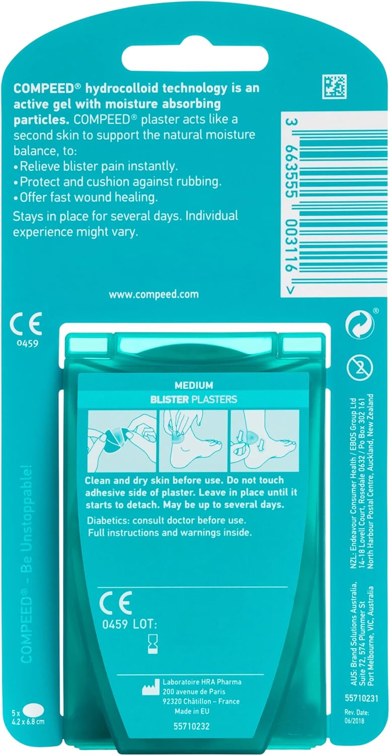 Compeed Medium Size Blister Plasters, 5 Hydrocolloid Plasters, Foot Treatment, Heal Fast, Dimensions: 4.2 Cm X 6.8 Cm (Pack Of 2)