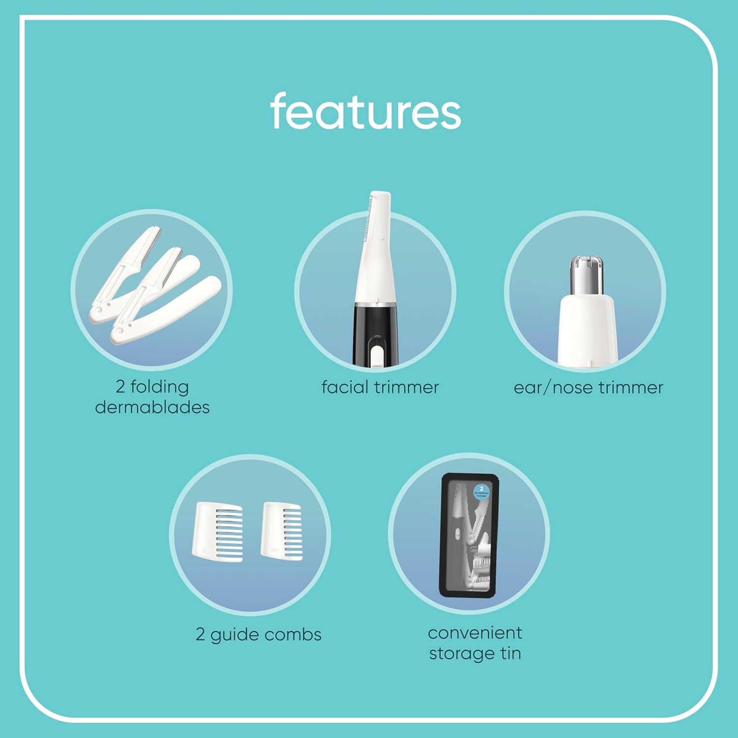 9 Piece All-in-One Trimmer Kit for Women: Ear/Nose Trimmer, Pen Trimmer, 2 Eyebrow Combs, 2 Disposable Dermablades, Storage Tin and AAA Battery Included