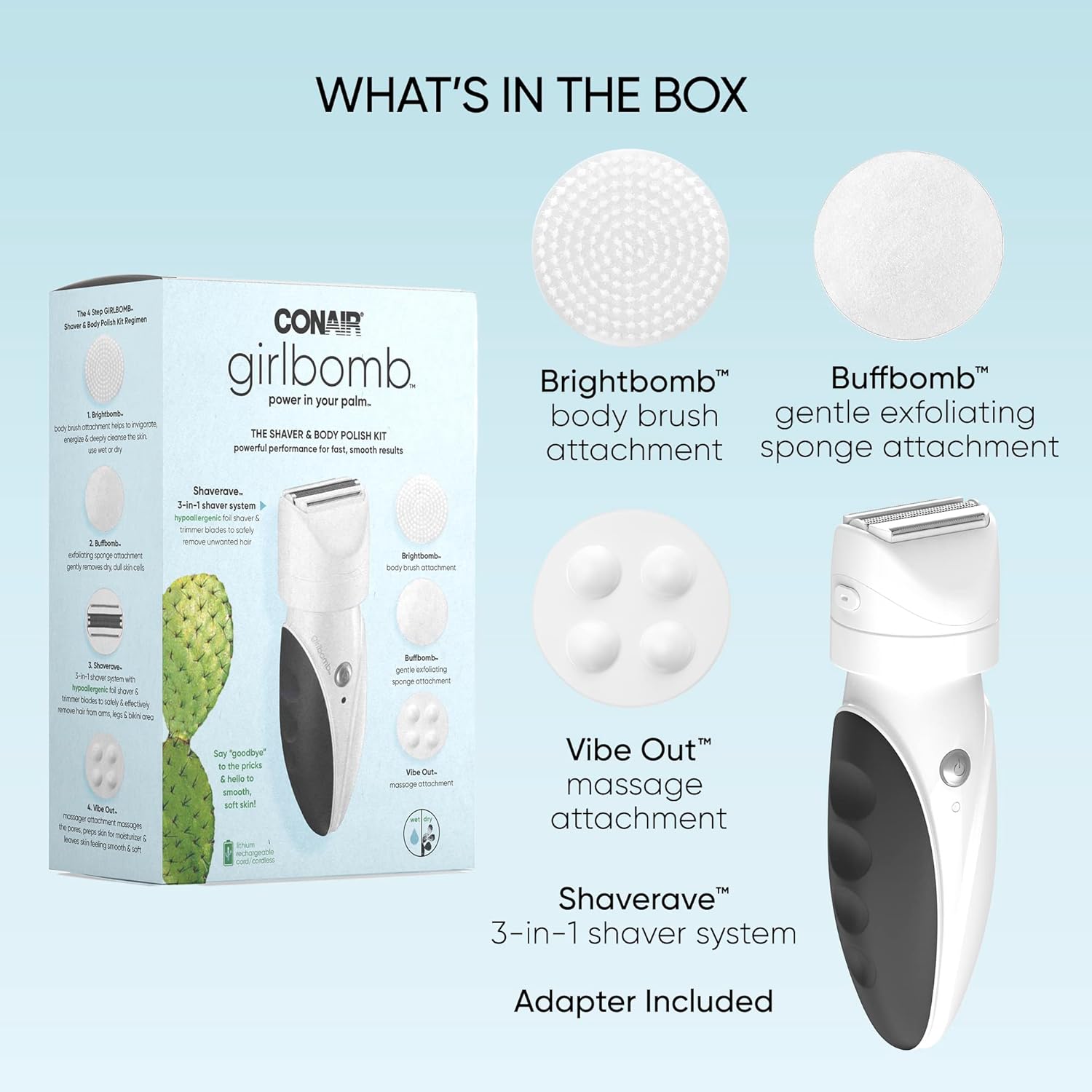 About this item Shaver and Body Polish Kit: Powerful performance that cleanses, exfoliates, shaves, and massages skin with fast, smooth results. Ergonomic Handle and Corded or Cordless Use: The Girlbomb Grip is contoured to fit perfectly in the palm of your hand. Use cordless with 120-minute runtime on full charge or corded for full power anytime. Interchangeable Attachments: Invigorate, exfoliate, shave, and massage your skin with a customized 4-step system that brings out your shine. Brightbomb body brush attachment, Buffbomb sponge attachment, Shaverave shaver attachment, Vibe Out massager attachment. Brightbomb Body Brush invigorates and deeply cleanses. The Buffbomb Sponge gently exfoliates. The Shaverave 3-in-1 shaver has hypoallergenic foil shaver and trimmer blades that safely, quickly, and effectively removes arm, bikini, and body hair. The Vibe Out massager preps skin for moisturizer. Waterproof: The Girlbomb Shaver & Body Polish Kit can be used and washed under water when unplugged. Do not use with or in water when the device is plugged in. › See more product details,Shaver and Body Polish Kit: Powerful performance that cleanses, exfoliates, shaves, and massages skin with fast, smooth results,Ergonomic Handle and Corded or Cordless Use: The Girlbomb Grip is contoured to fit perfectly in the palm of your hand. Use cordless with 120-minute runtime on full charge or corded for full power anytime,Interchangeable Attachments: Invigorate, exfoliate, shave, and massage your skin with a customized 4-step system that brings out your shine. Brightbomb body brush attachment, Buffbomb sponge attachment, Shaverave shaver attachment, Vibe Out massager attachment,Brightbomb Body Brush invigorates and deeply cleanses. The Buffbomb Sponge gently exfoliates. The Shaverave 3-in-1 shaver has hypoallergenic foil shaver and trimmer blades that safely, quickly, and effectively removes arm, bikini, and body hair. The Vibe Out massager preps skin for moisturizer,Waterproof: The Girlbomb Shaver & Body Polish Kit can be used and washed under water when unplugged. Do not use with or in water when the device is plugged in