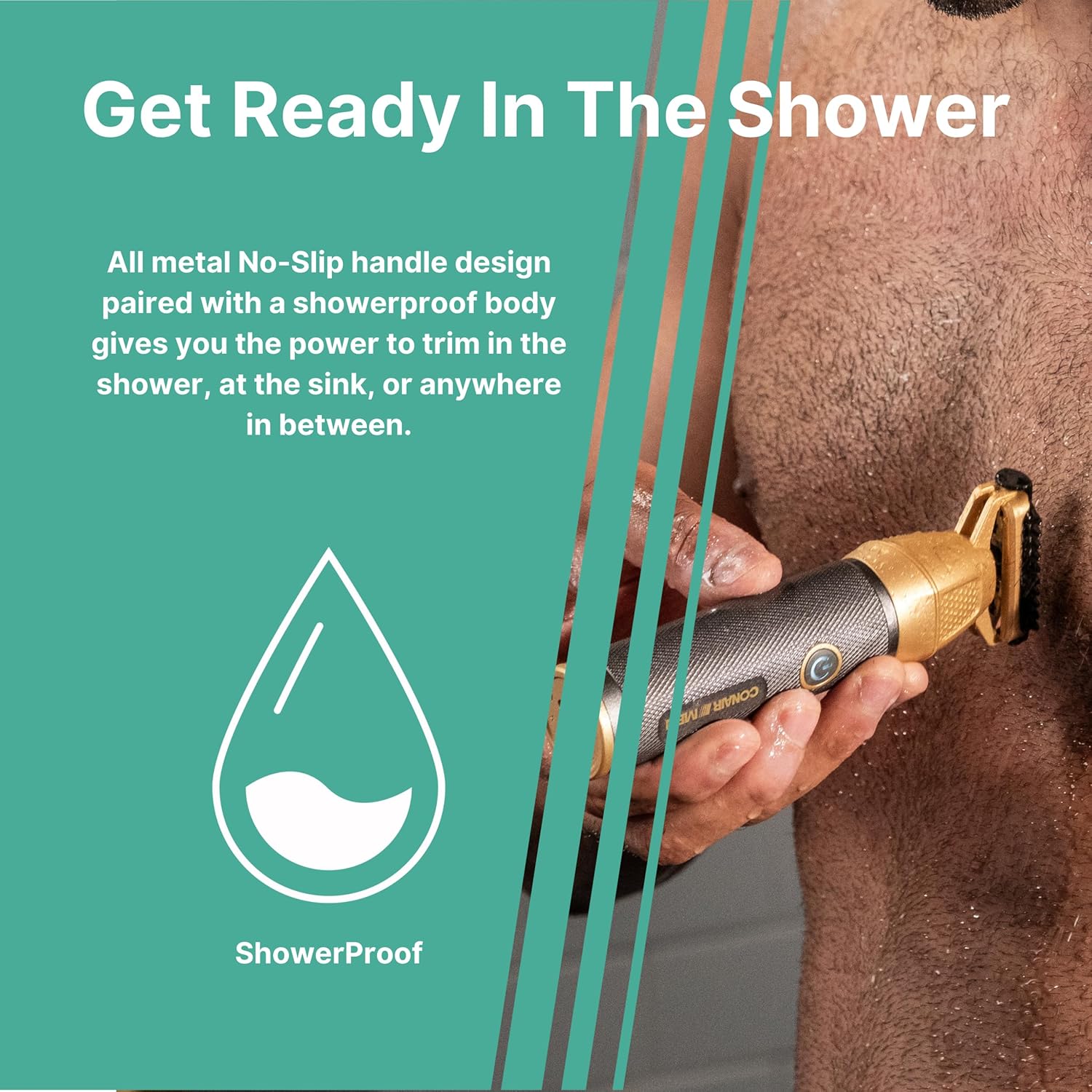 About this item PERFECT YOUR LOOK: Switch seamlessly between 8 guide combs—a 5-position adjustable comb, 3 jawline combs, 2 body grooming combs, and 2 manscaping combs. SHOWERPROOF WITH NO SLIP GRIP: Contain the mess to the tub. All-rubber no-slip grip ensures you have a firm hold on the trimmer for grooming, trimming, and shaving in or out of the shower. LONG-LASTING PERFORMANCE: Lithium-ion battery has a 5-hour runtime. Charge up quickly with the included universal USB-C cord. PERSONAL CARE FROM CONAIR: Our personal care line includes high-quality skincare tools, lighted mirrors, haircut kits, beard & mustache trimmers + ear/nose trimmers, ladies shavers & oral care. Conair makes every personal care tool for your daily routine › See more product details,PERFECT YOUR LOOK: Switch seamlessly between 8 guide combs—a 5-position adjustable comb, 3 jawline combs, 2 body grooming combs, and 2 manscaping combs,SHOWERPROOF WITH NO SLIP GRIP: Contain the mess to the tub. All-rubber no-slip grip ensures you have a firm hold on the trimmer for grooming, trimming, and shaving in or out of the shower,LONG-LASTING PERFORMANCE: Lithium-ion battery has a 5-hour runtime. Charge up quickly with the included universal USB-C cord,PERSONAL CARE FROM CONAIR: Our personal care line includes high-quality skincare tools, lighted mirrors, haircut kits, beard & mustache trimmers + ear/nose trimmers, ladies shavers & oral care. Conair makes every personal care tool for your daily routine