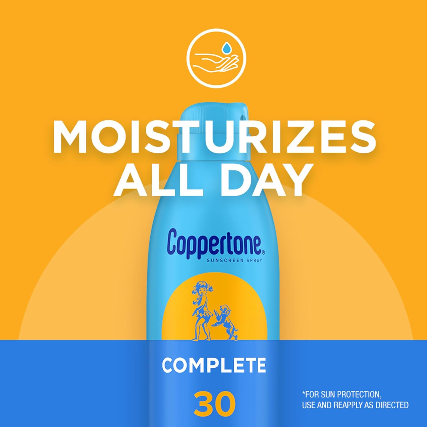 About this item Multi-Benefit Formula: Coppertone spray sunscreen SPF 30 offers everyday sun protection for the whole family in a multi-benefit formula to help skin in more ways than one UVA/UVB Protection: Broad Spectrum sunscreen offers UVA/UVB protection All-Day Moisturizing: Coppertone Complete SPF 30 Sunscreen Spray is water resistant (80 minutes), and moisturizes all day(1) Free Of: This Coppertone sunscreen SPF 30 spray is free from oxybenzone, octinoxate, PABA, phthalates and dyes Includes one (1) 5.5 ounce bottle of Coppertone Complete SPF 30 Sunscreen Spray  See more product details,Multi-Benefit Formula: Coppertone spray sunscreen SPF 30 offers everyday sun protection for the whole family in a multi-benefit formula to help skin in more ways than one,UVA/UVB Protection: Broad Spectrum sunscreen offers UVA/UVB protection,All-Day Moisturizing: Coppertone Complete SPF 30 Sunscreen Spray is water resistant (80 minutes), and moisturizes all day(1),Free Of: This Coppertone sunscreen SPF 30 spray is free from oxybenzone, octinoxate, PABA, phthalates and dyes,Includes one (1) 5.5 ounce bottle of Coppertone Complete SPF 30 Sunscreen Spray